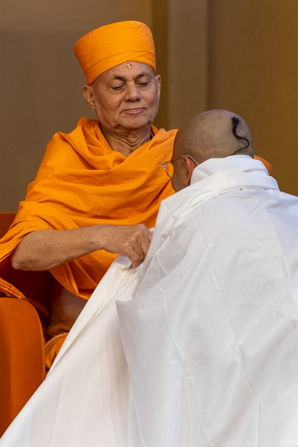 Atmatrupt Swami and Madhurvadan Swami honor Swamishri with a shawl