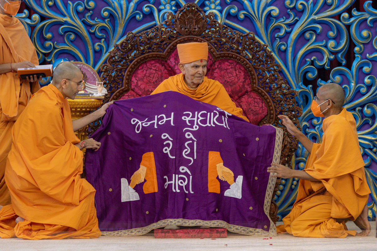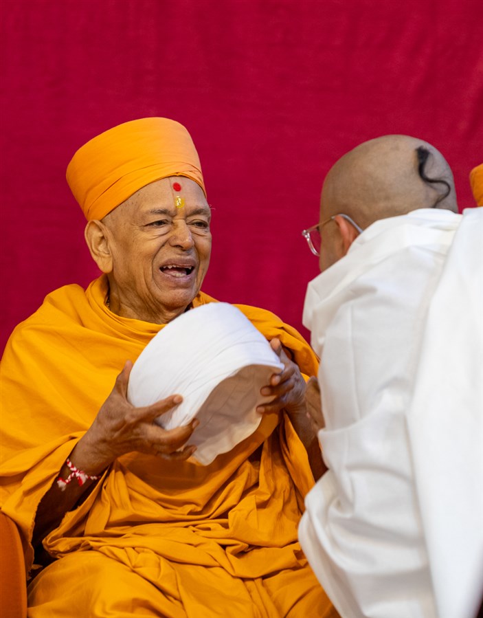 Swamishri observes a shawl