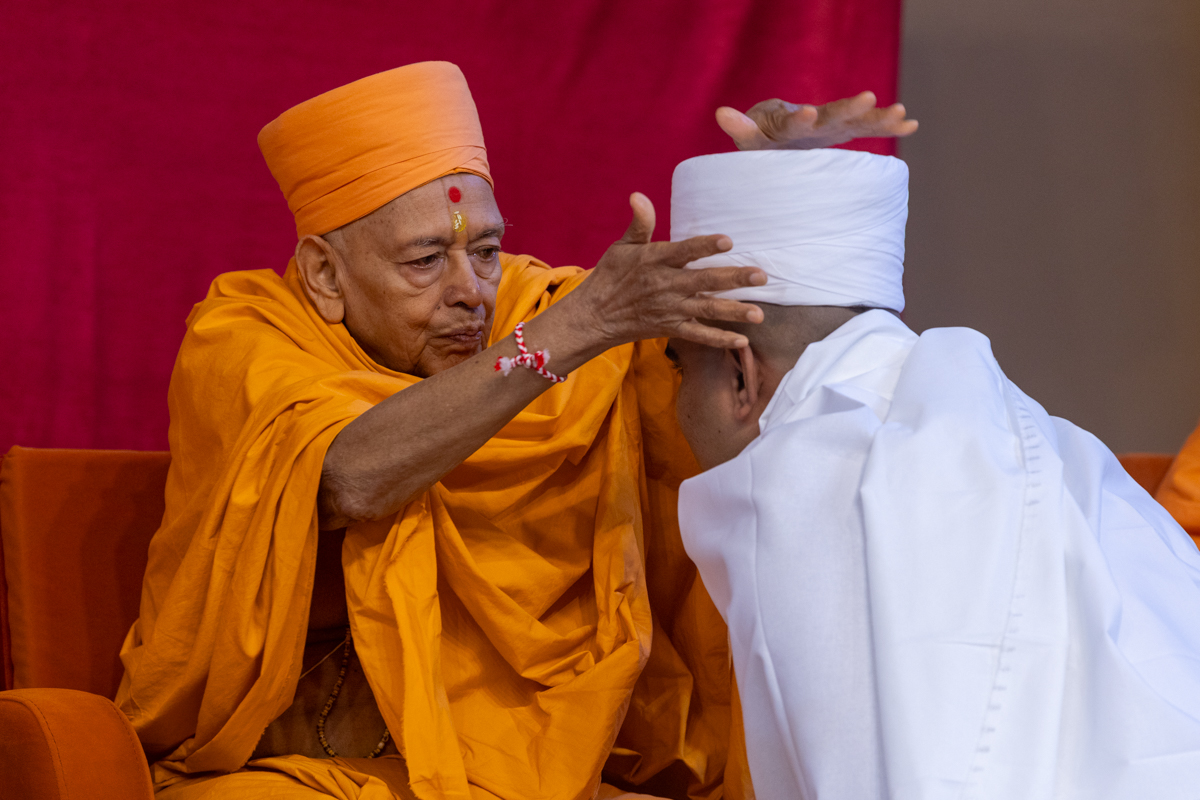 Pujya Tyagvallabh Swami places a pagh on a newly initiated parshad