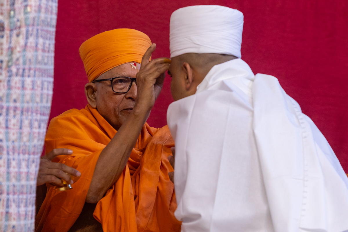 Pujya Kothari Swami applies a chandlo and chandan archa to a newly initiated parshad