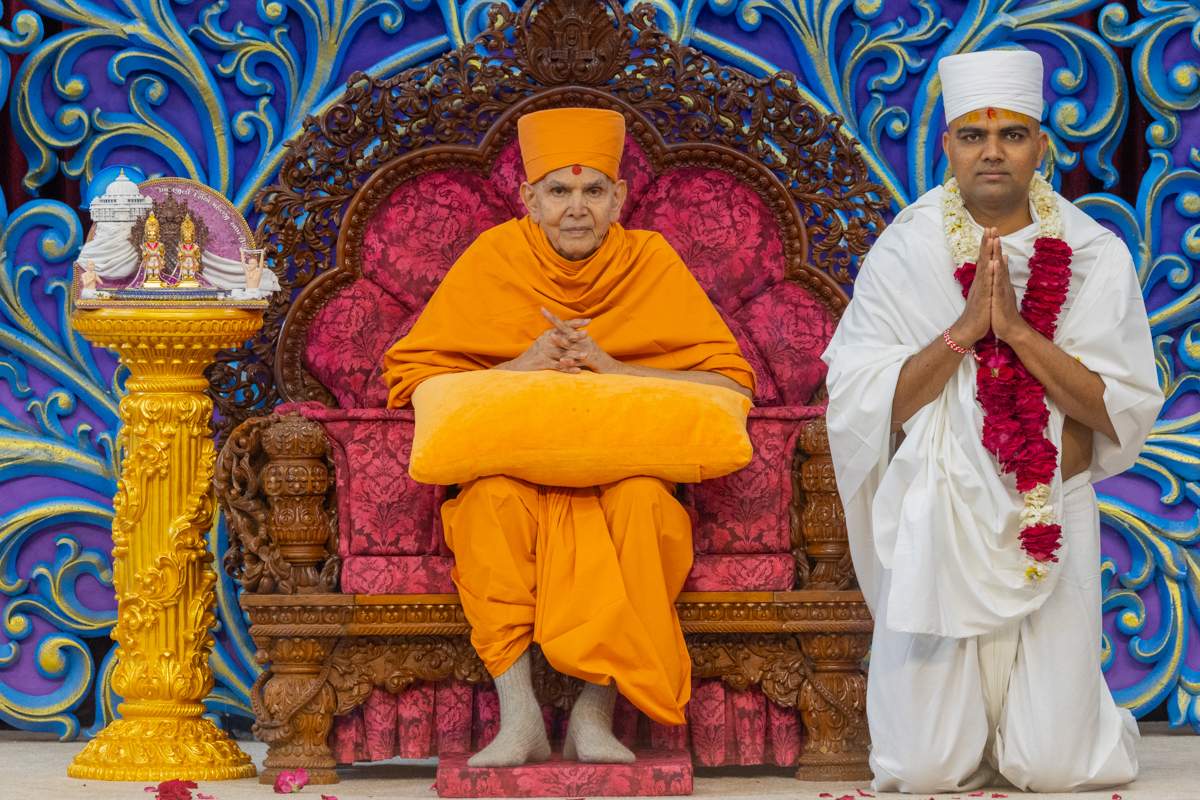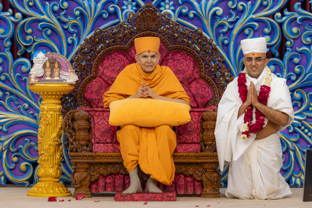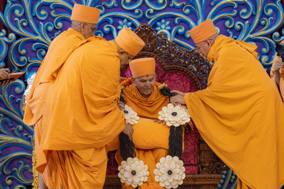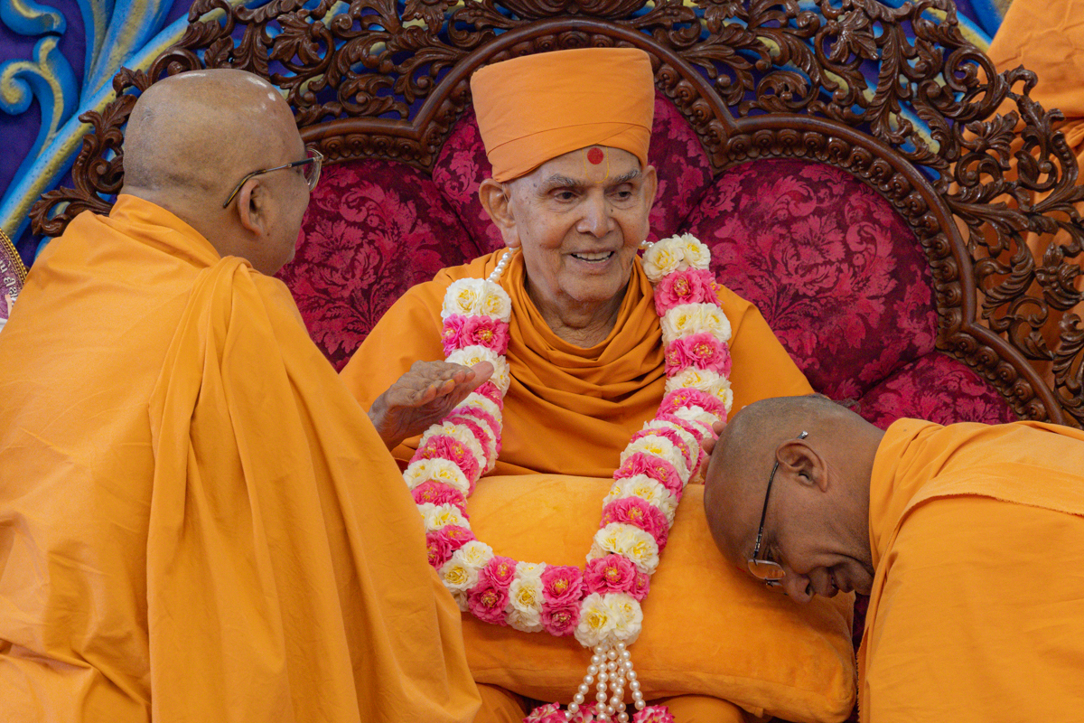 Bhadresh Swami and Bhaktisagar Swami honor Swamishri with a garland