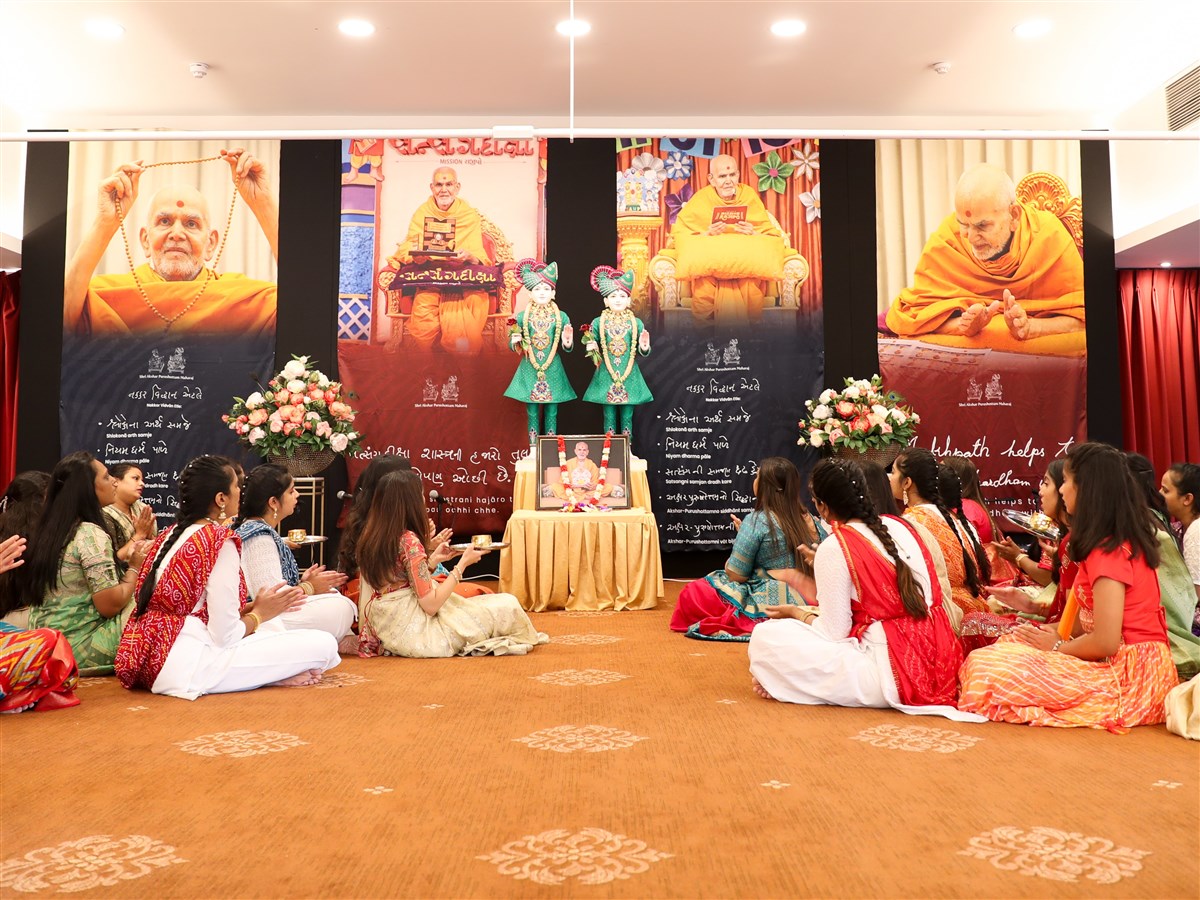 Mahilas of BAPS Shri Swaminarayan Mandir, Manchester, celebrated the 92nd birth anniversary of Mahant Swami Maharaj with colourful devotional programme.