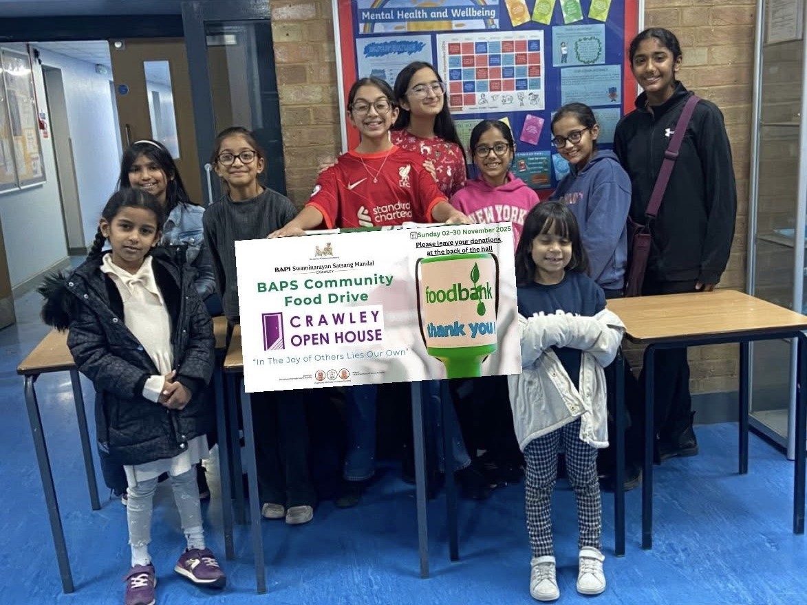 Volunteers from BAPS Swaminarayan Satsang Mandal, Crawley, UK, joined together in a nationwide drive this winter to support local families facing food insecurity through their annual Community Food Drive.