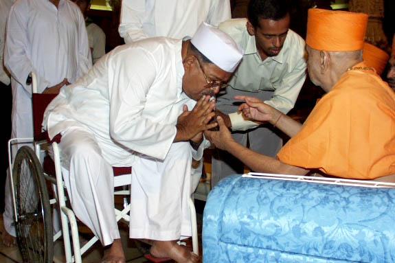 After the assembly Swamishri consoles and blesses relatives of the deceased victims inside the main monument