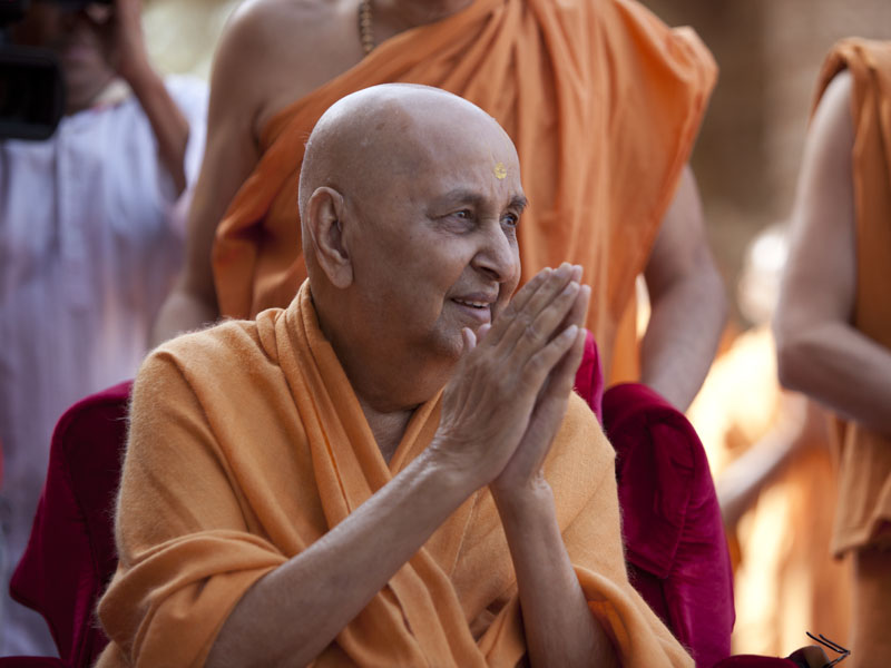 Swamishri arrives at Yagnapurush Smruti Mandir for darshan