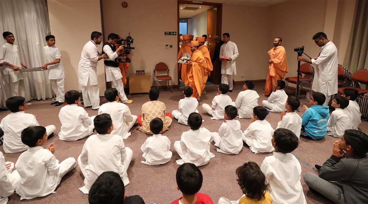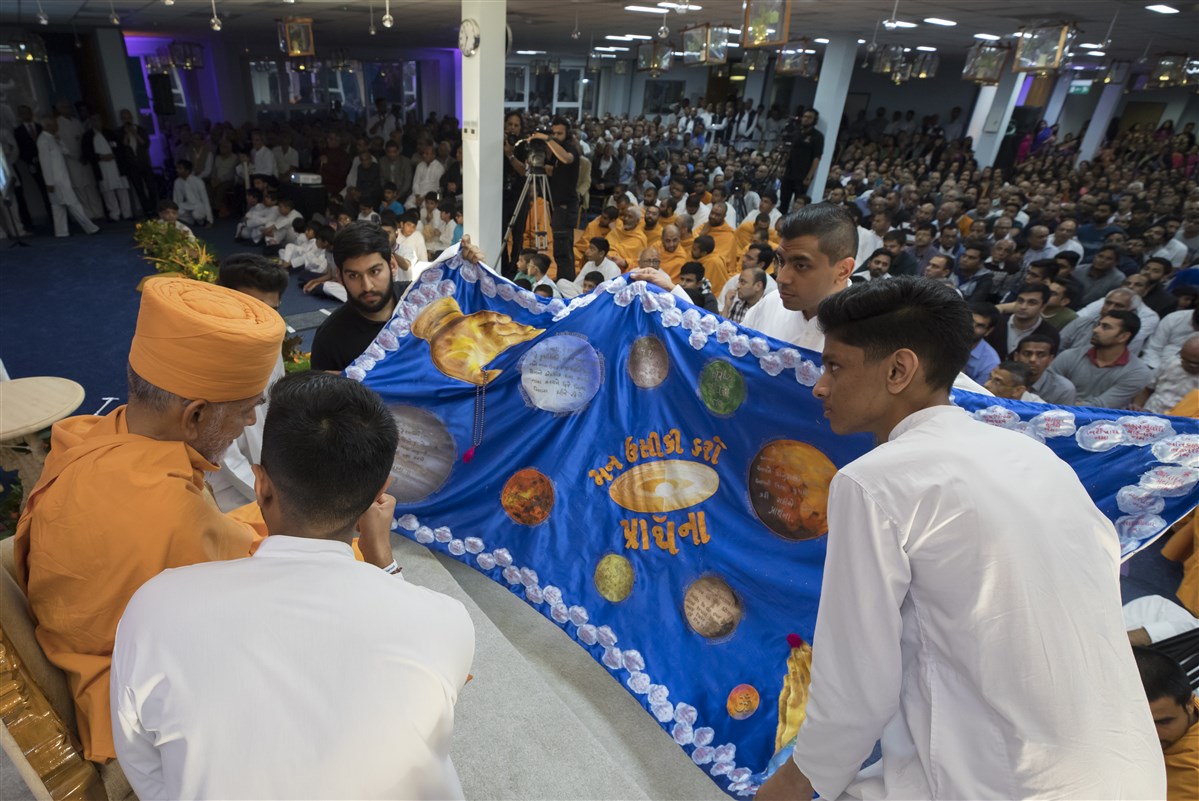 Swamis formerly from South London offered a decorative garland to Swamishri