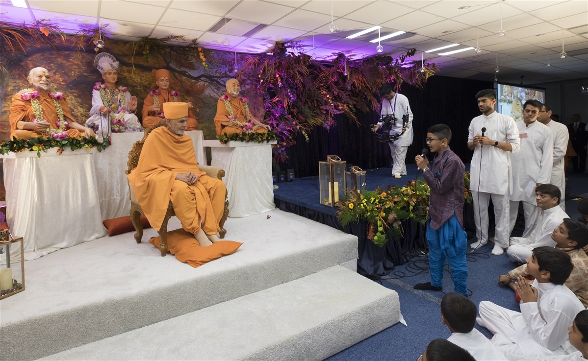 Volunteers warmly greeted Swamishri in the assembly with a decorative garland