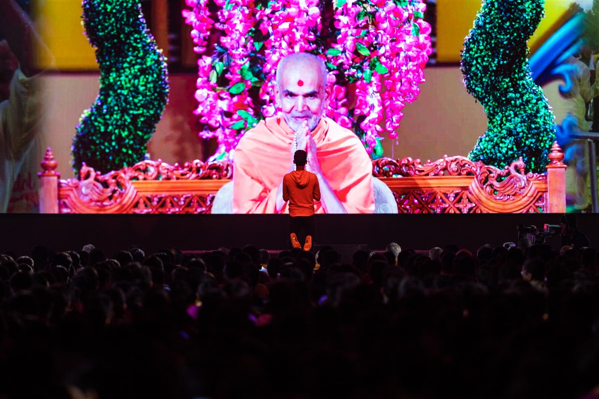 Delegates offer a lotus to Param Pujya Mahant Swami Maharaj