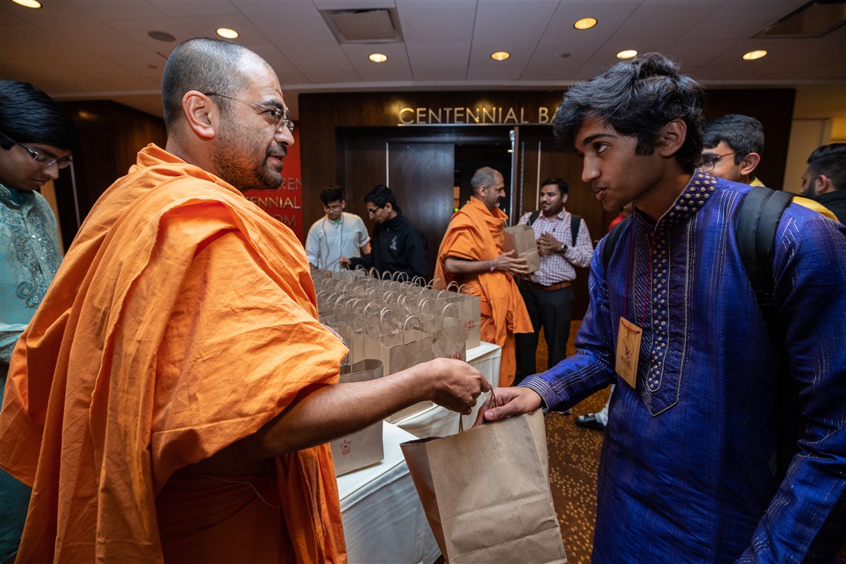 Pujya Shukmunidas Swami hands delegates convention mementos