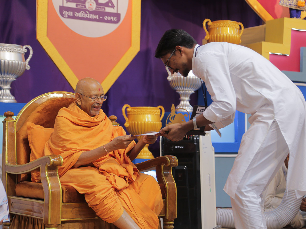 Swamishri presents prizes to the youths who attained high distinction in the Vachanamrut Mukhpath competition