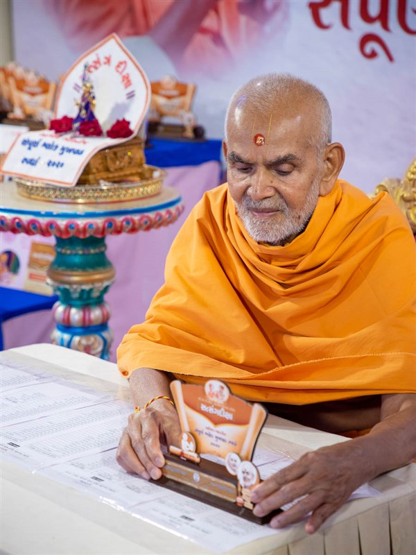 Swamishri engrossed in darshan of Shri Harikrishna Maharaj on his arrival in the assembly