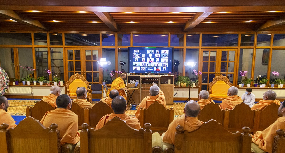 Yogvivekdas Swami addressed the devotees from the upper sanctum in a brief online sabha after the Sandhya Arti