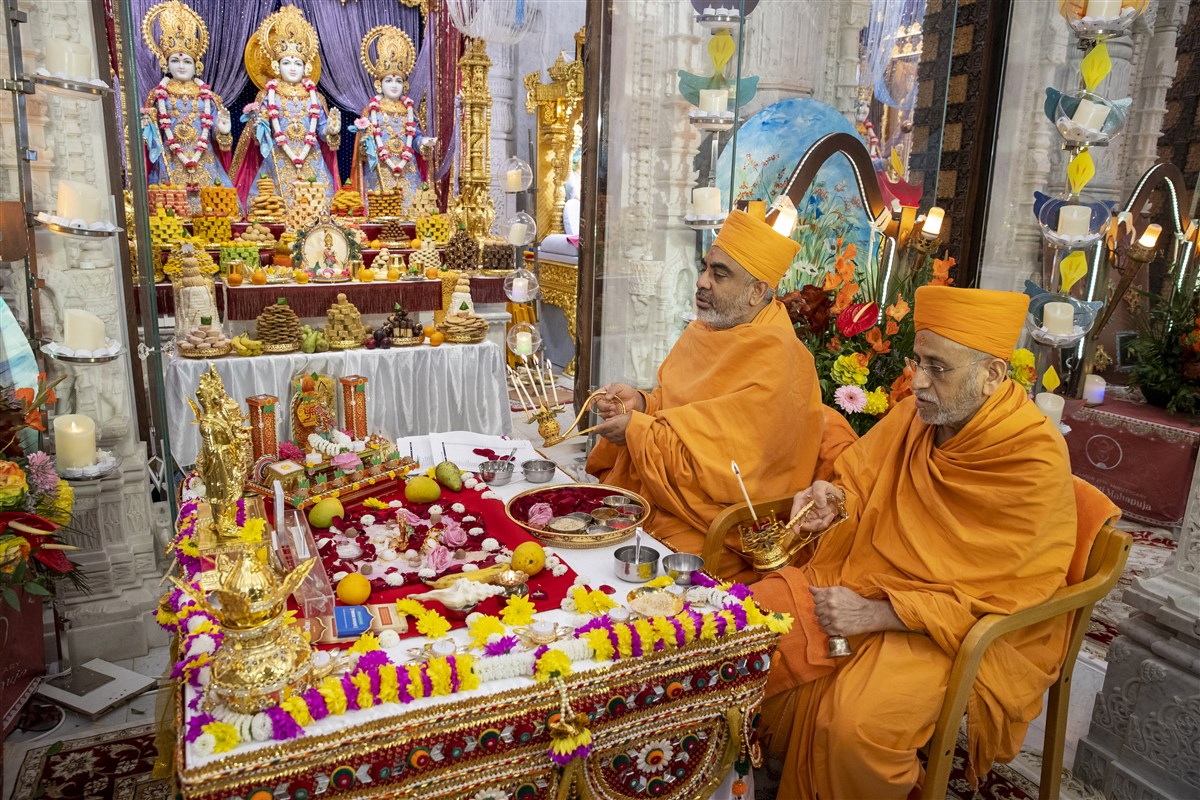 Yogvivekdas Swami and Satyavratdas Swami performed the Govardhan Puja in thanksgiving to Bhagwan for his protection and providence