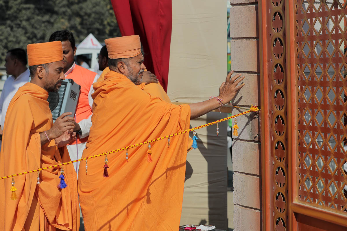 Param Pujya Mahant Swami Maharaj performs mandir pravesh rituals