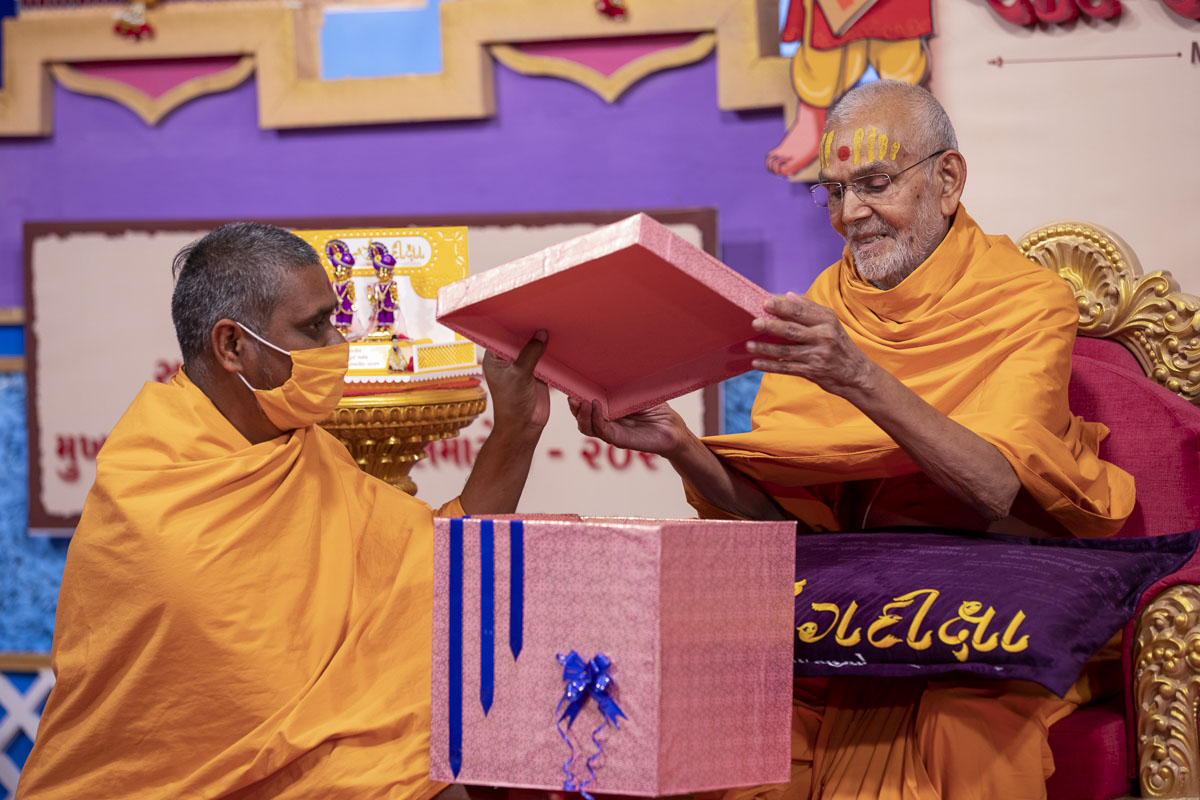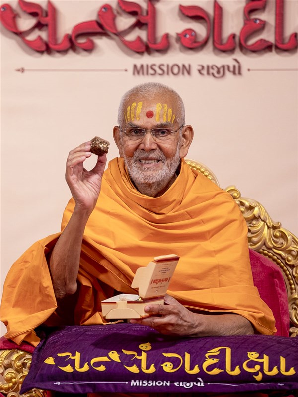 On 16 March 2021, Swamishri threads a mala to be presented to the children
