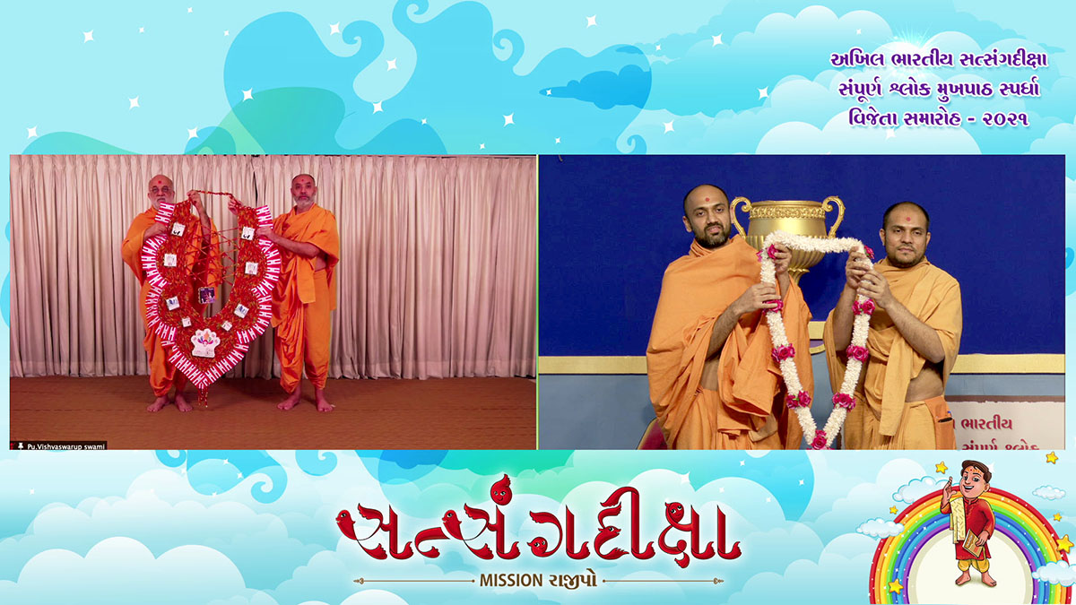 Pujya Ishwarcharan Swami honors Swamishri with a garland