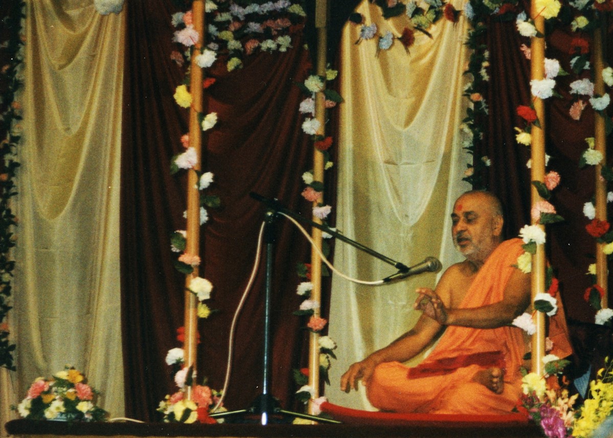 Pramukh Swami Maharaj addressing a public assembly in Ashton-under-Lyne in 1990