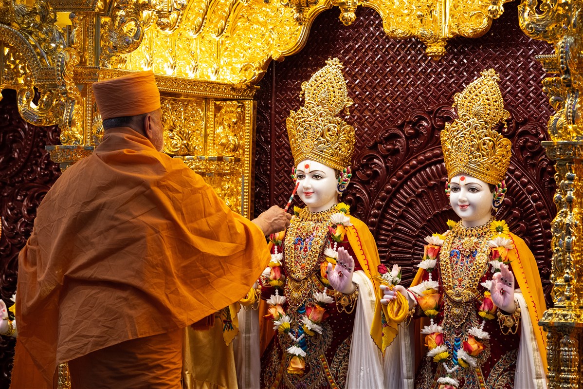 Pujya Kothari Swami performed the ceremony that welcomed the murtis to their new sinhasan on 31 August 2014
