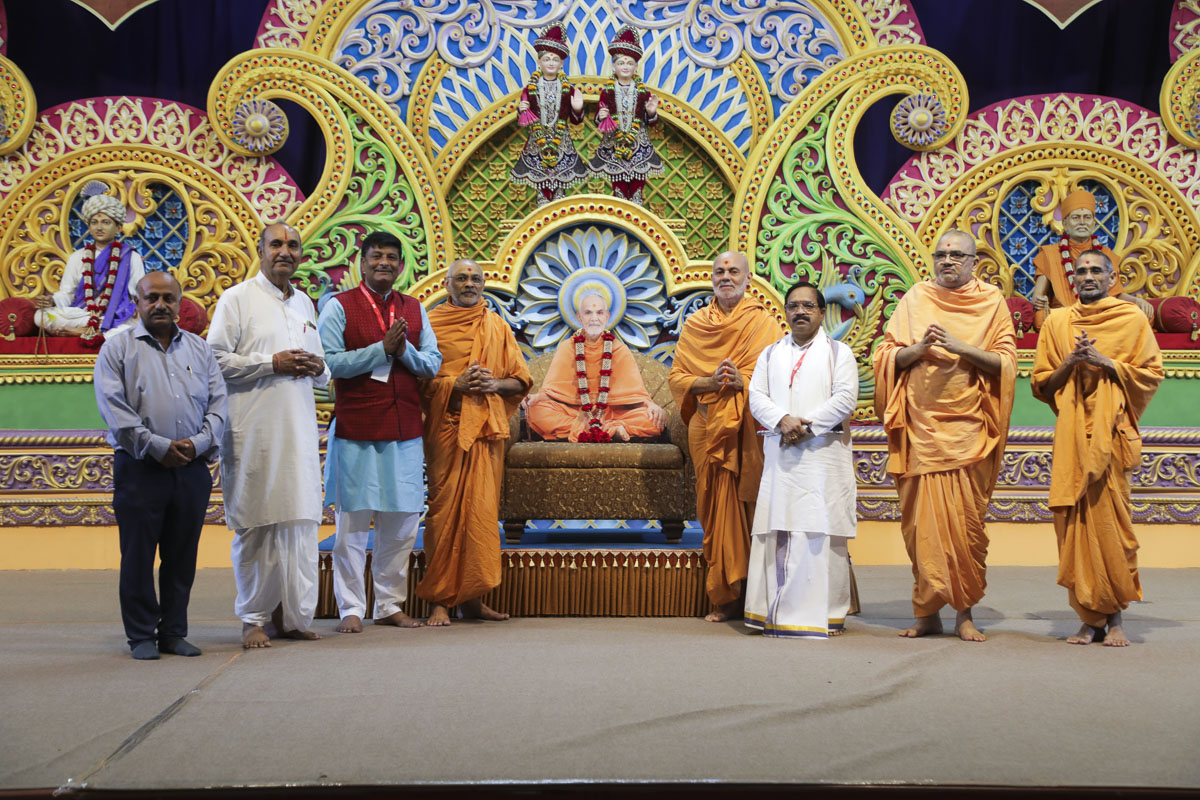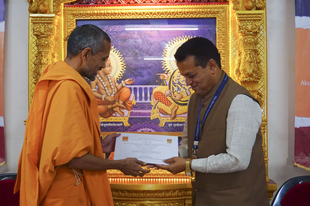 Prof. Amrutlal Bhogaytaji, Principal of Shri Brahmarshi Sanskrit Mahavidyalaya, honors Pujya Bhadresh Swami