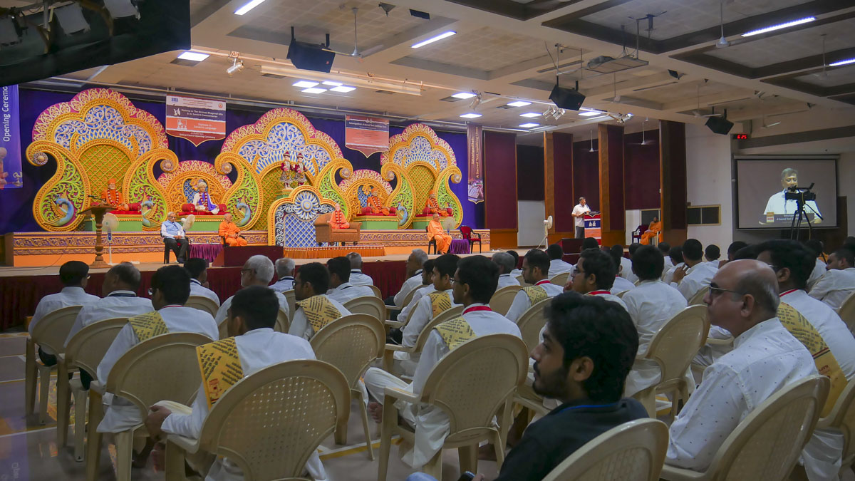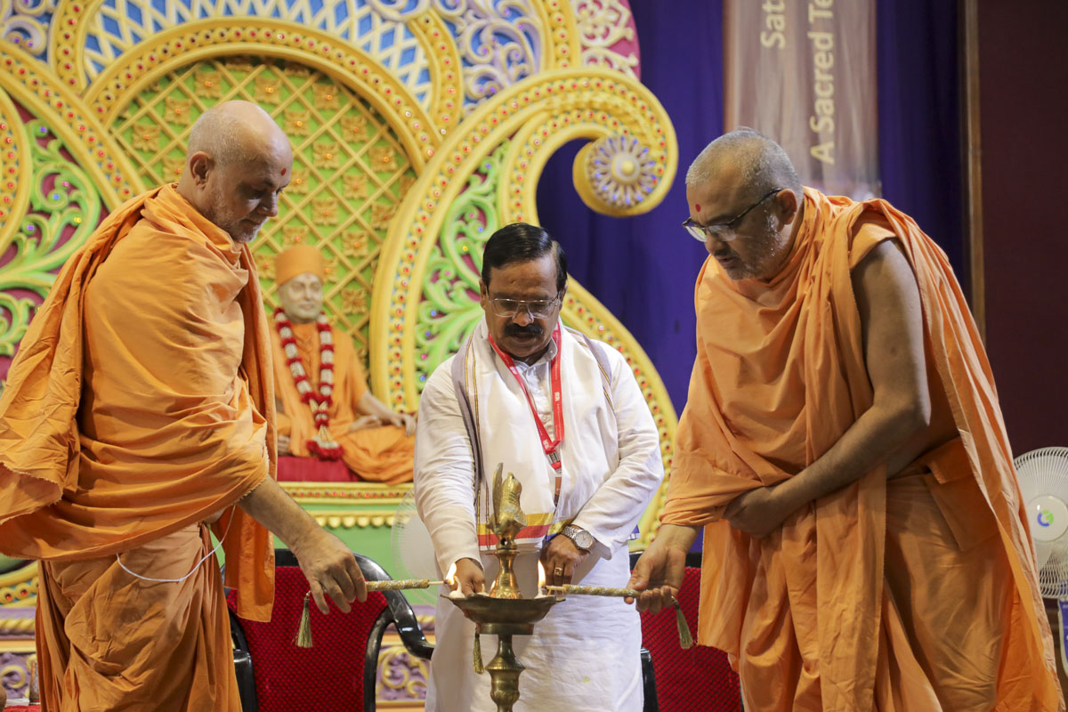 Param Pujya Mahant Swami Maharaj and Pujya Swayamprakash Swami (Doctor Swami) light the inaugural lamp for the Satsang Diksha international conference