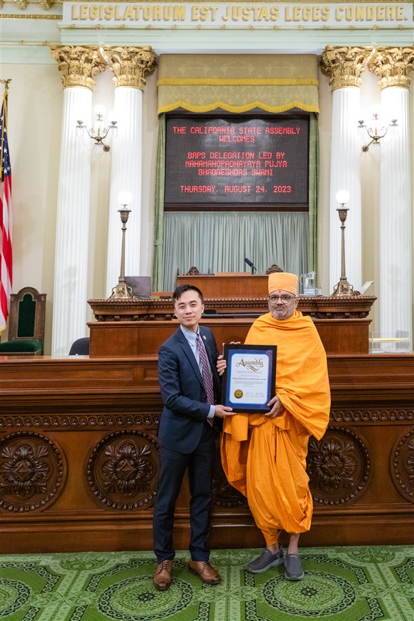 Assembly Member Alex Lee honors Mahamahopadhyay Bhadreshdas Swami for his academic achievements and contributions.