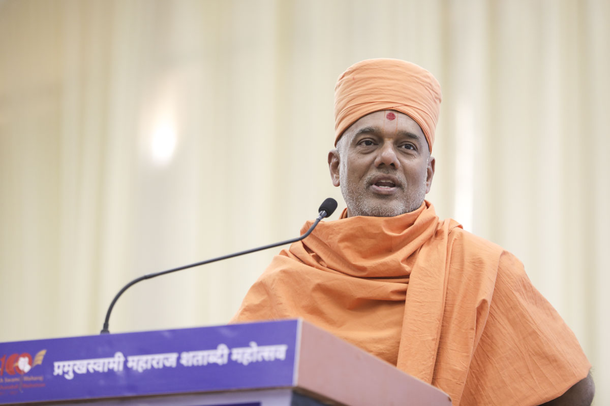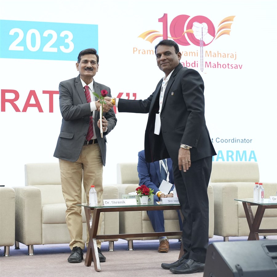 Pujya Brahmavihari Swami and Pujya Gnanvatsal Swami greeting Dr. Shrenik Shah, Chairman, IDMA GSB