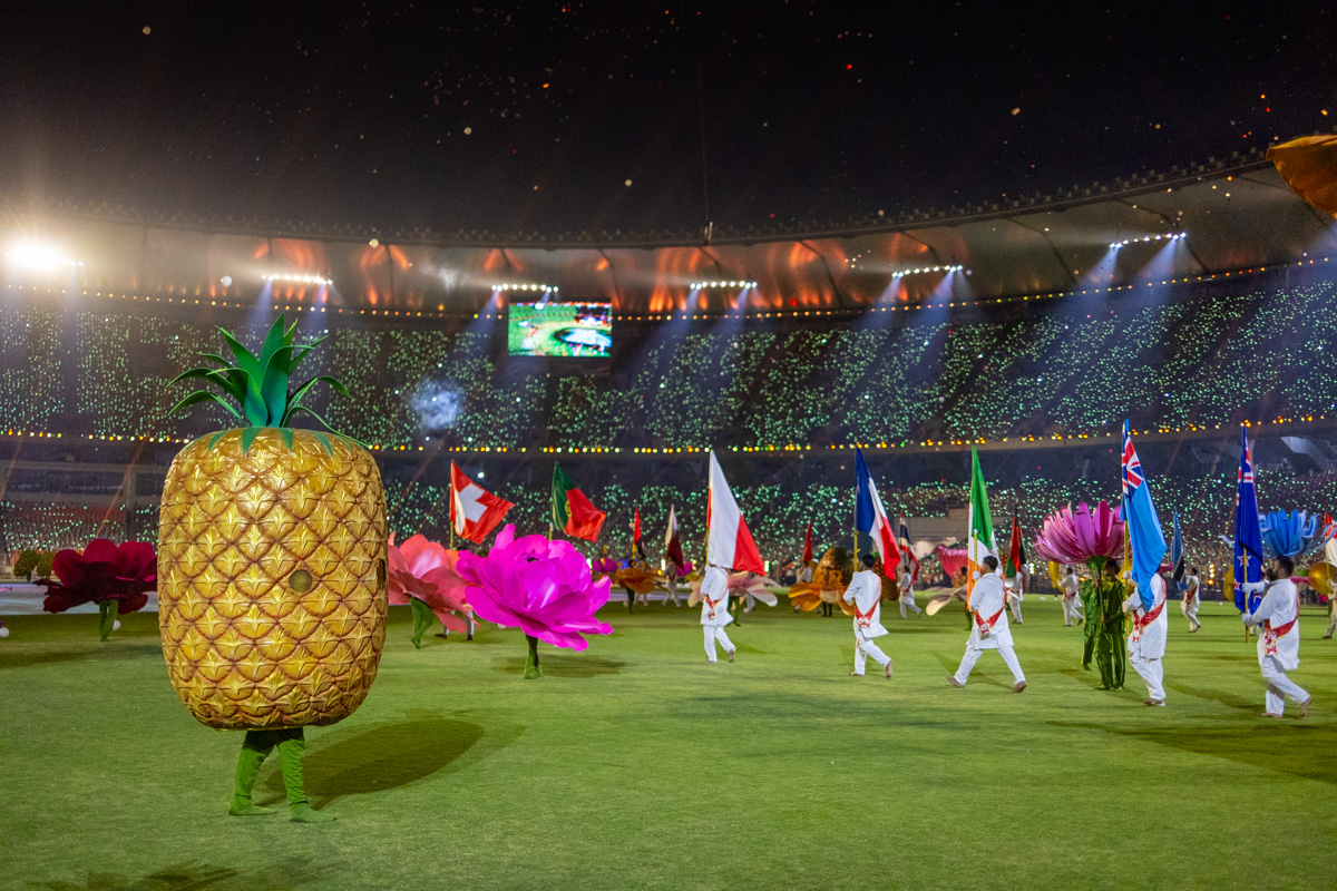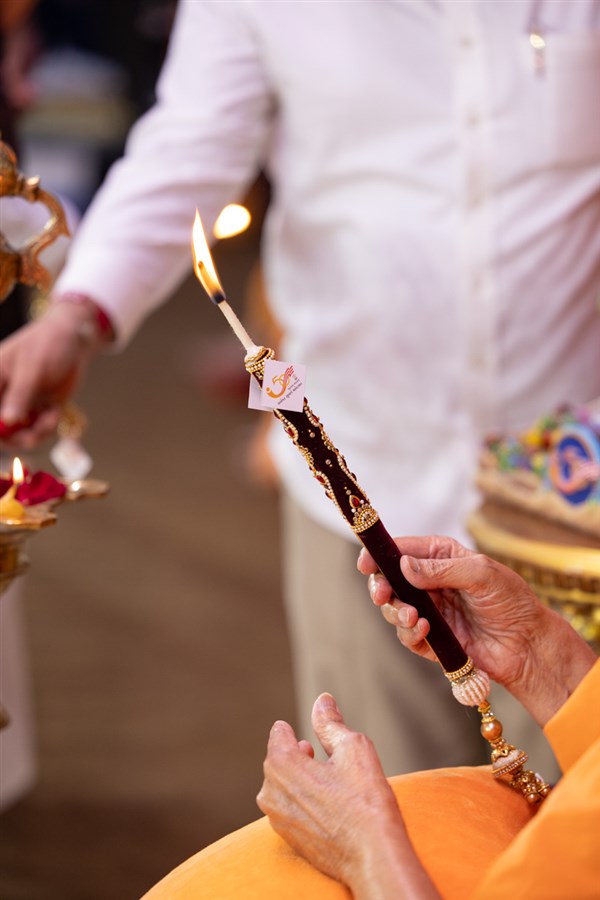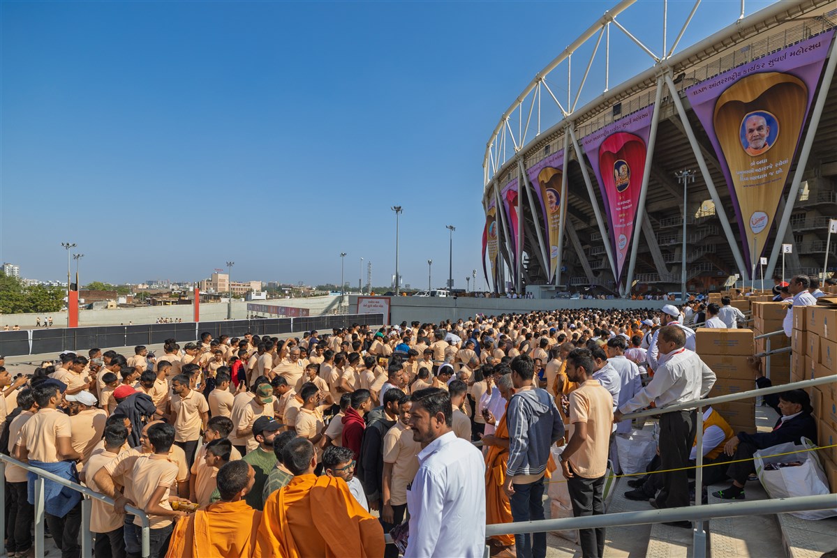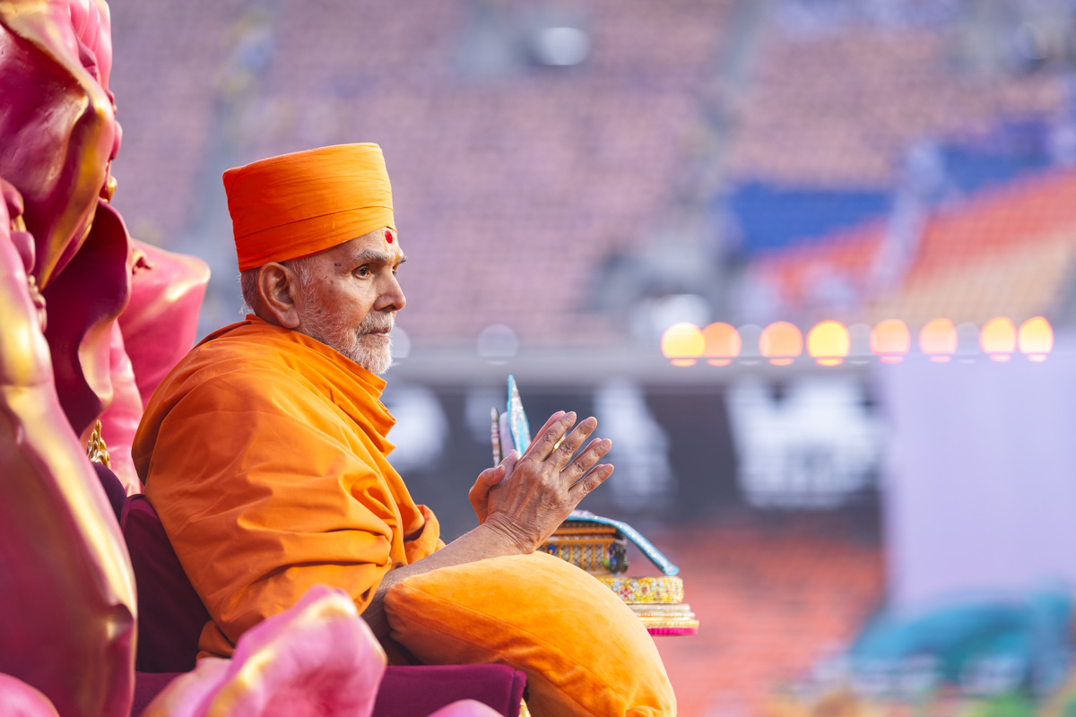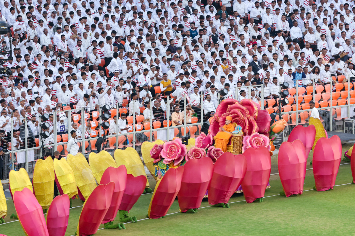 Param Pujya Mahant Swami Maharaj honored and welcomed in a parade on a decorated chariot around the perimeter of the stadium