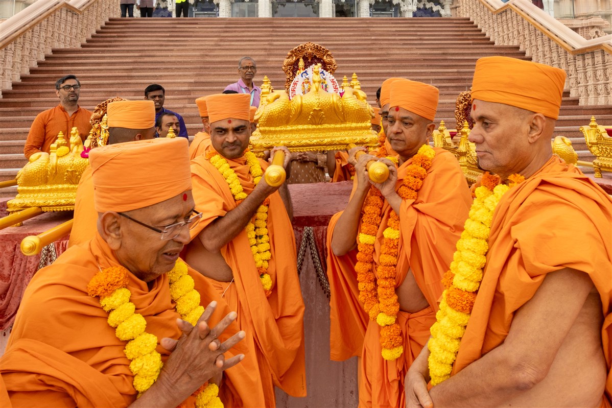 Swamis lift the palkhi of Shri Akshar-Purushottam Maharaj
