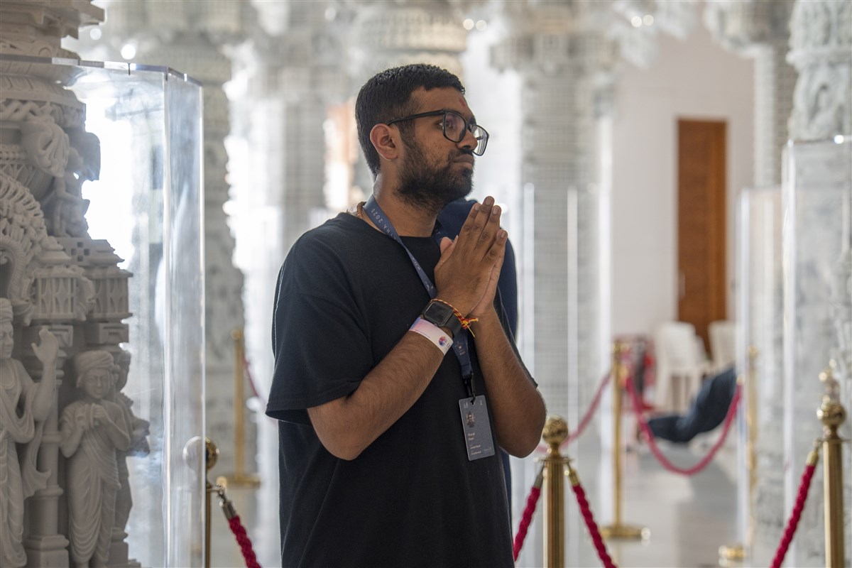 A delegate engaged in darshan at BAPS Hindu Mandir, Abu Dhabi