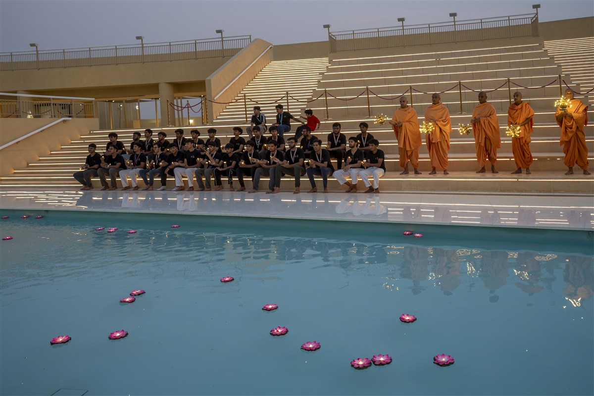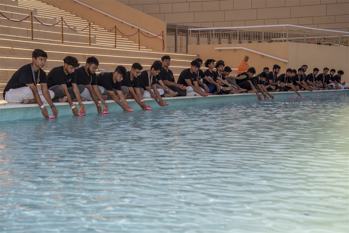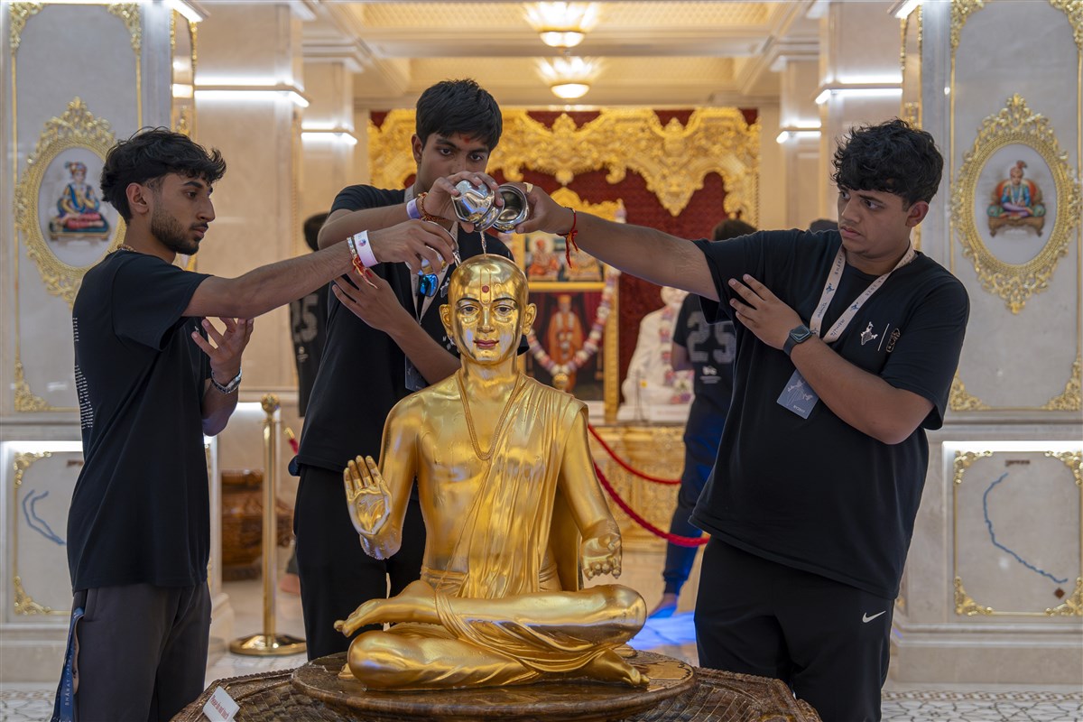 Delegates perform abhishek of Shri Sahajanand Swami at BAPS Hindu Mandir, Abu Dhabi