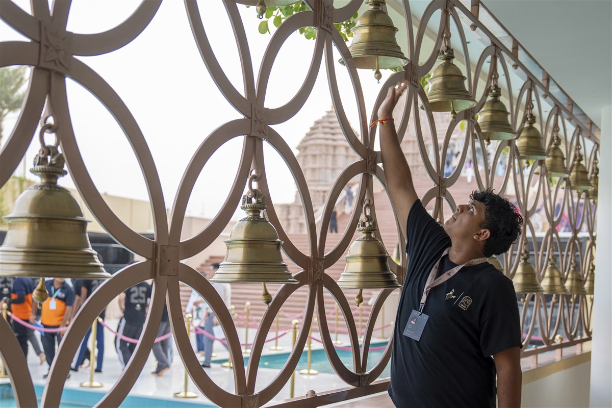 A delegate rings one of the many bells around BAPS Hindu Mandir, Abu Dhabi