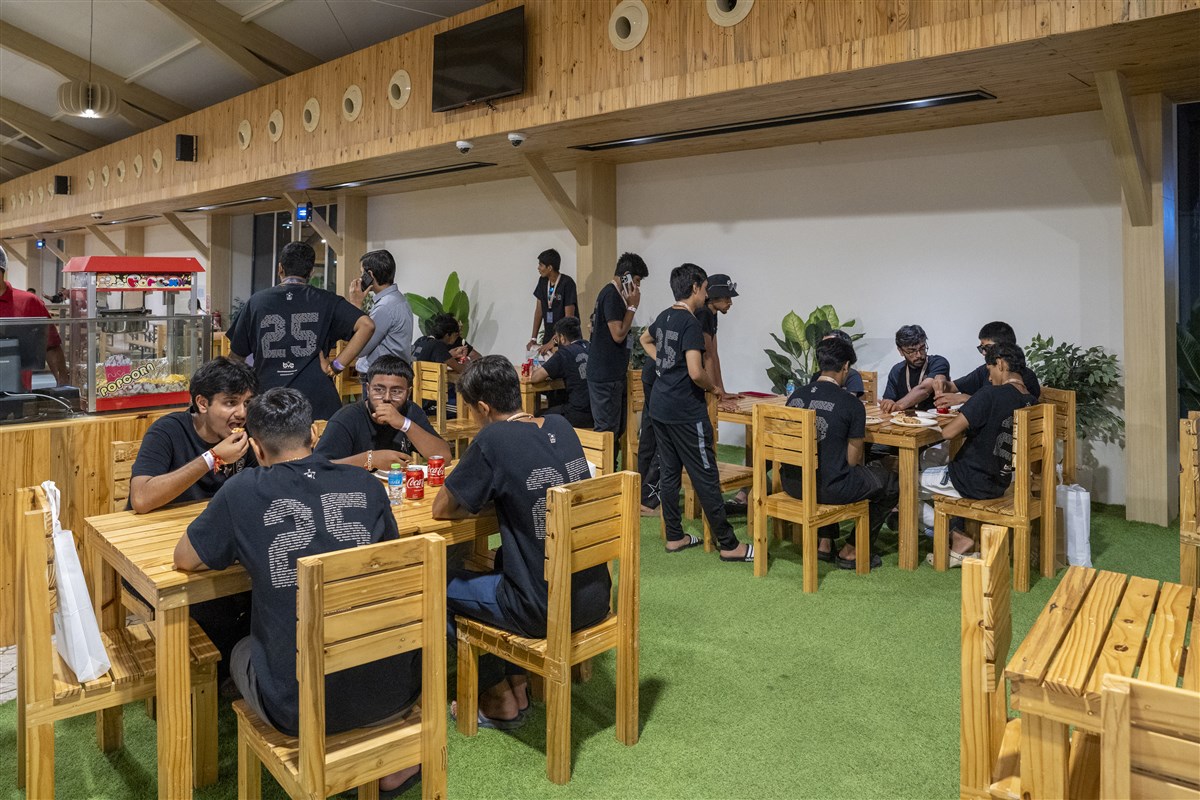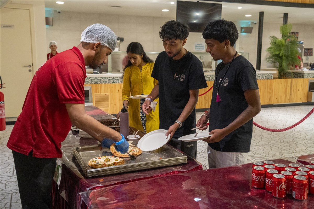 Delegates enjoy a meal at the Orchard food court situated at BAPS Hindu Mandir, Abu Dhabi
