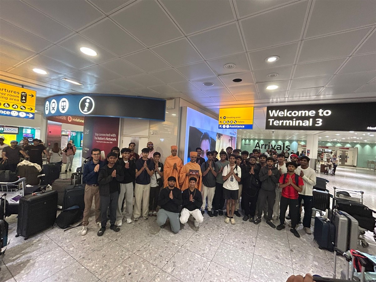 Group photo at London Heathrow Airport, marking the end of the 41-day yatra around India and Abu Dhabi