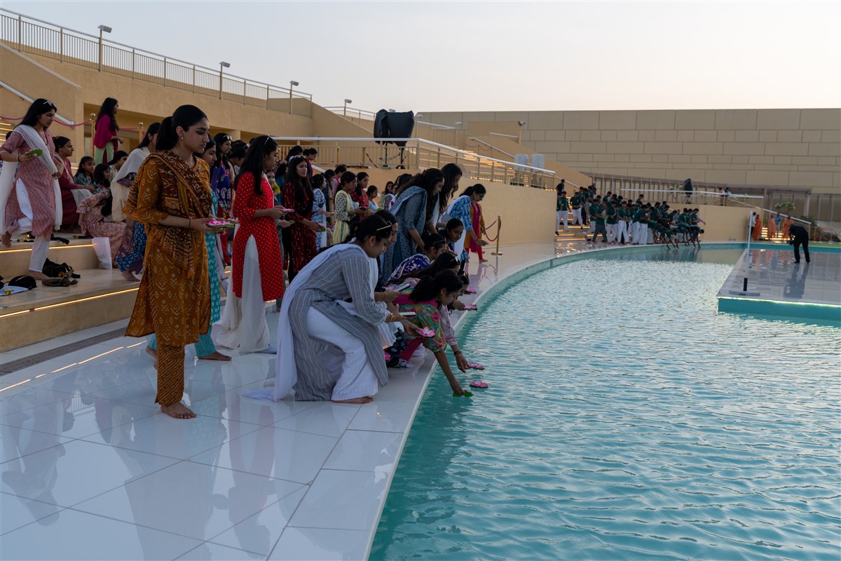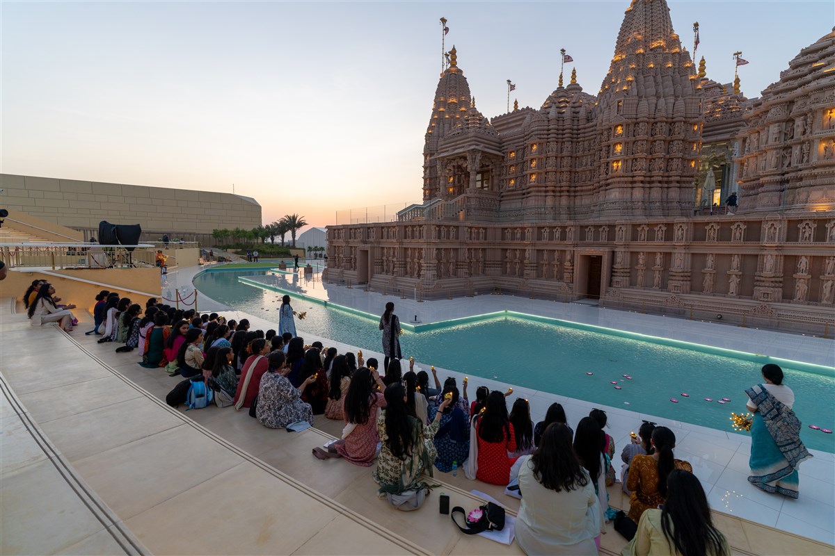 Delegates offer prayers by placing lotuses in the sacred water bodies encircling the mandir