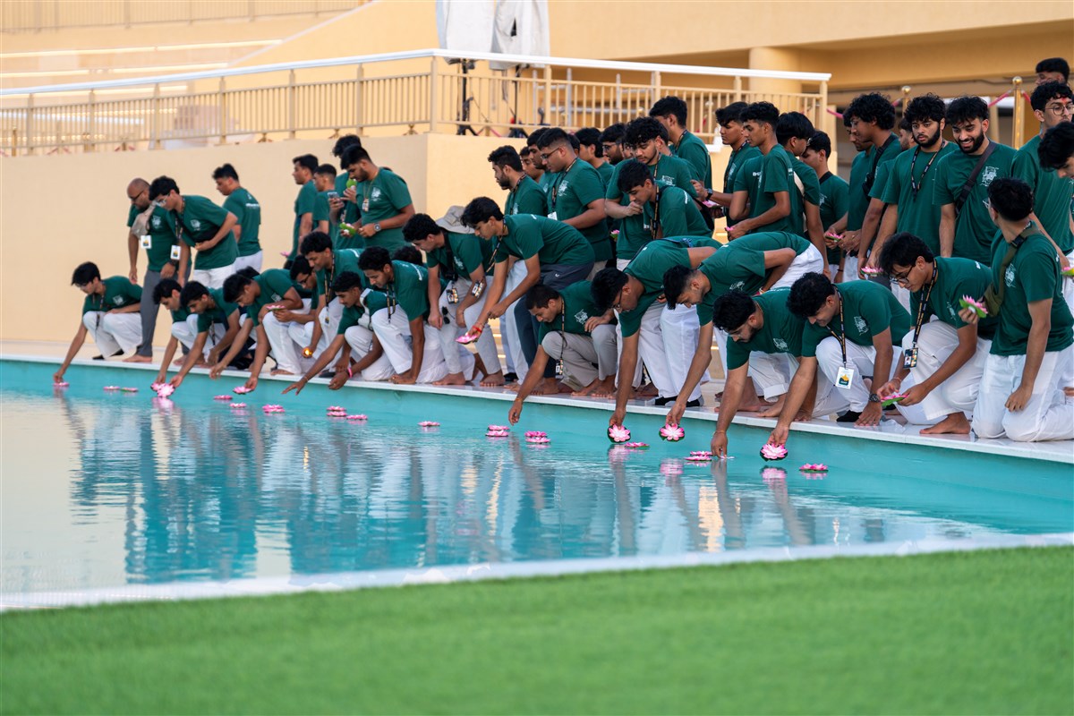 Delegates offer prayers by placing lotuses in the serene waters surrounding the mandir