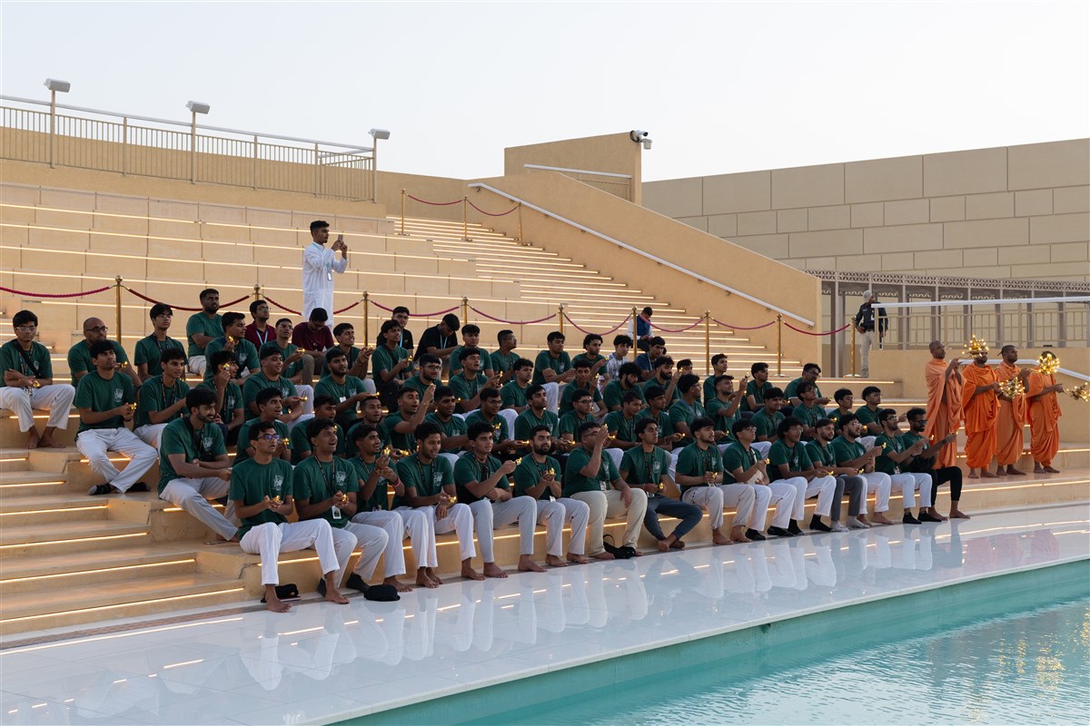 Delegates enjoy the tranquil view of the calm waters, the majestic mandir, and the setting sun as they perform the Ganga Arti
