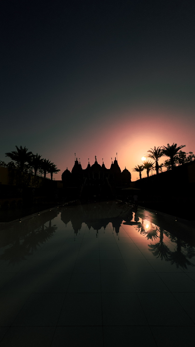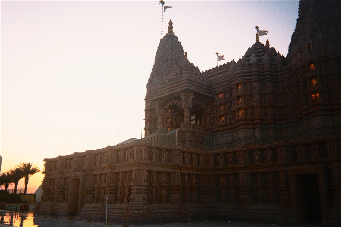 As the sun sets behind the mandir, its glow reflects the quiet harmony within each carved stone