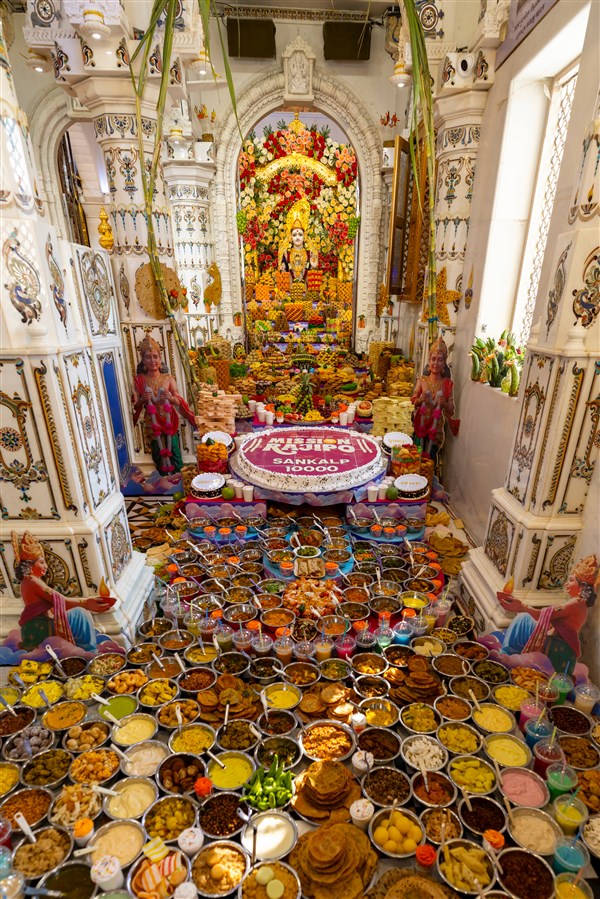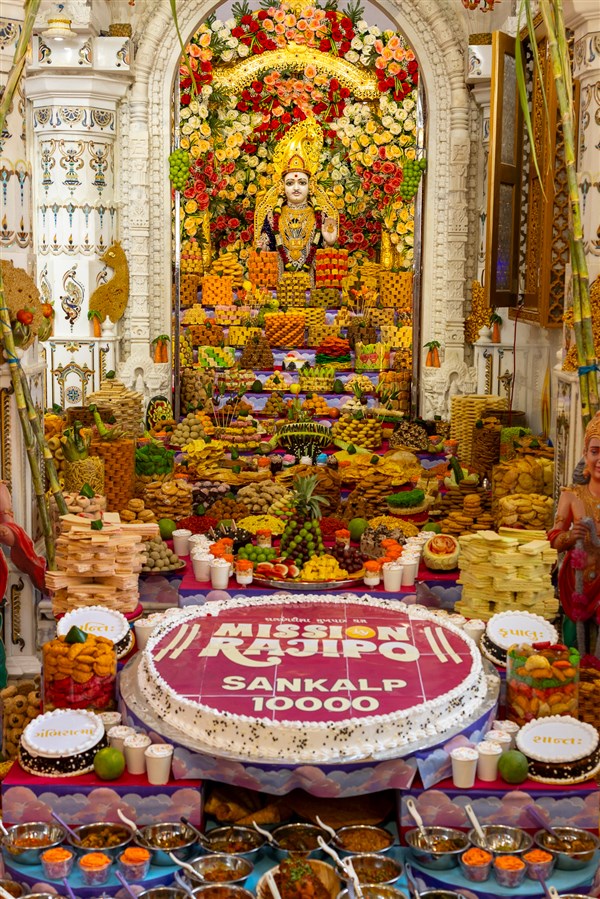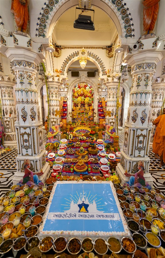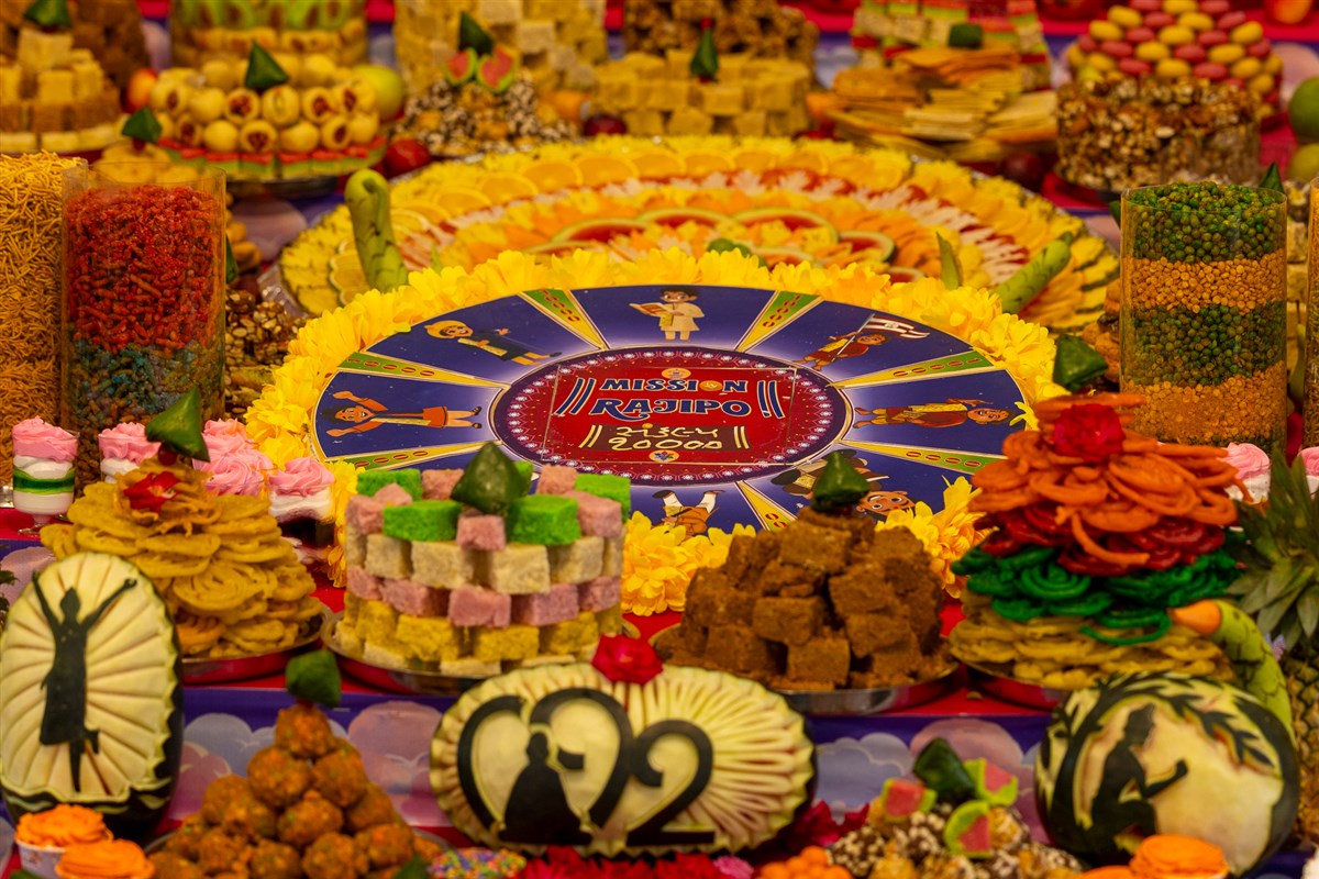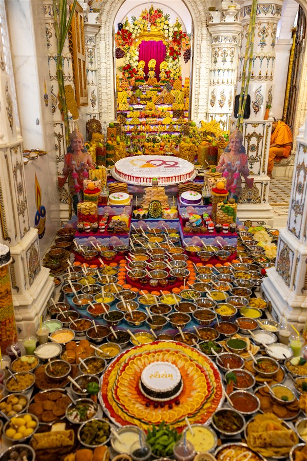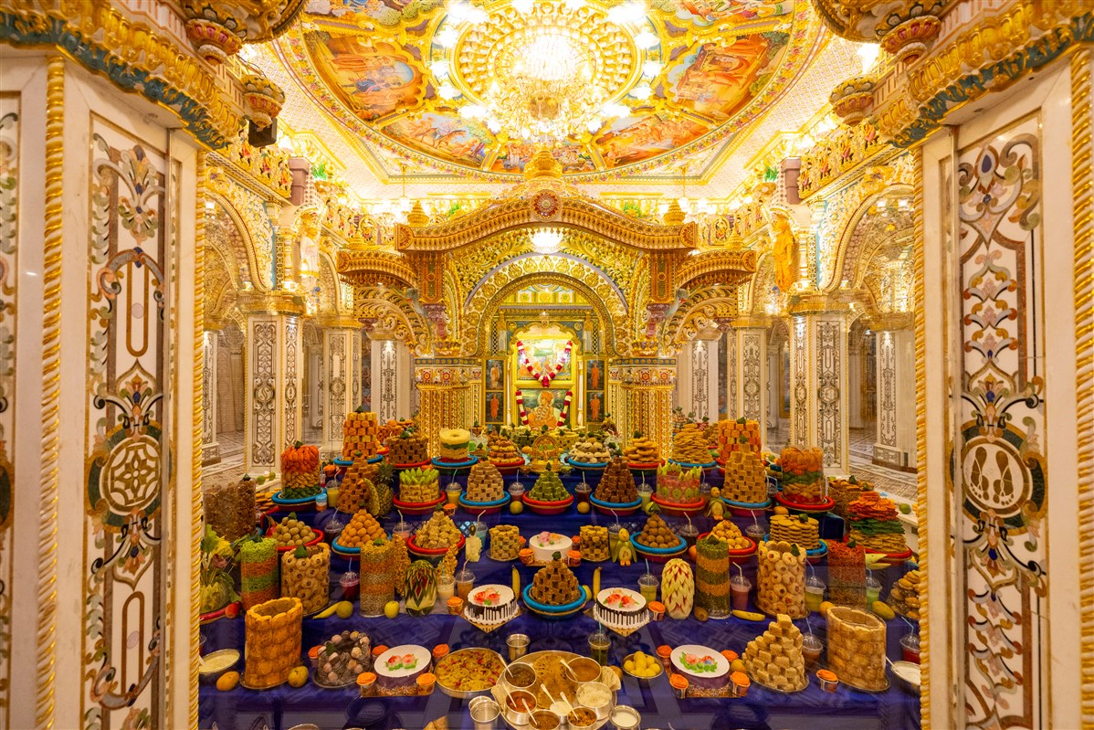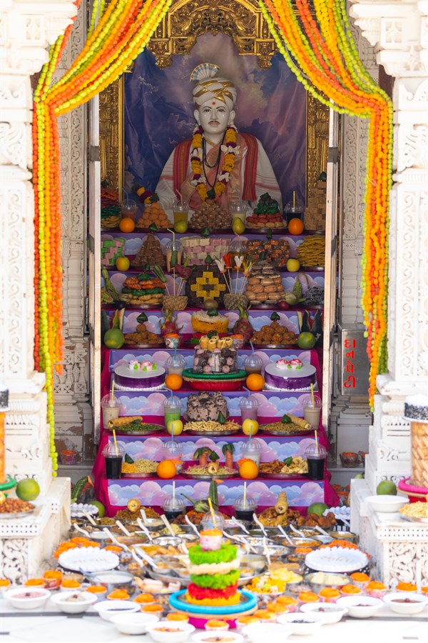 Annakut offered to Shri Akshar-Purushottam Maharaj and Brahmaswarup Yogiji Maharaj in Yogi Smruti Mandir