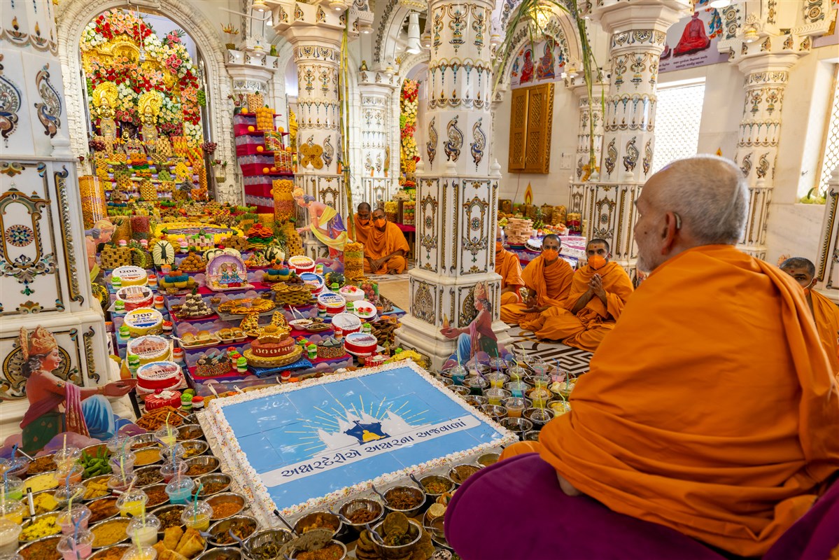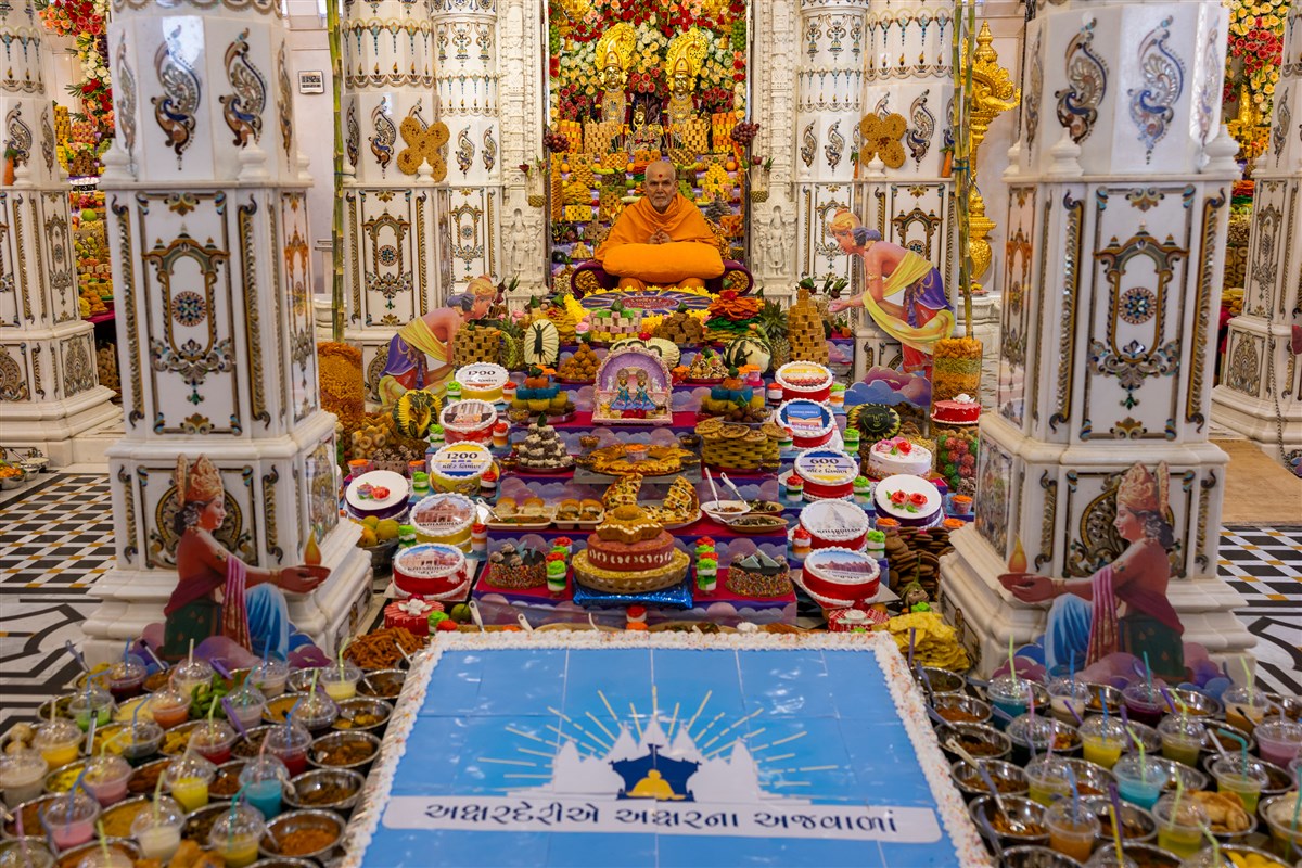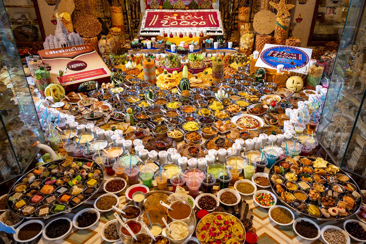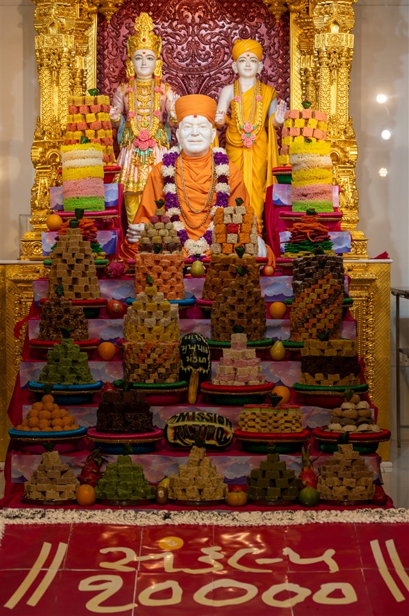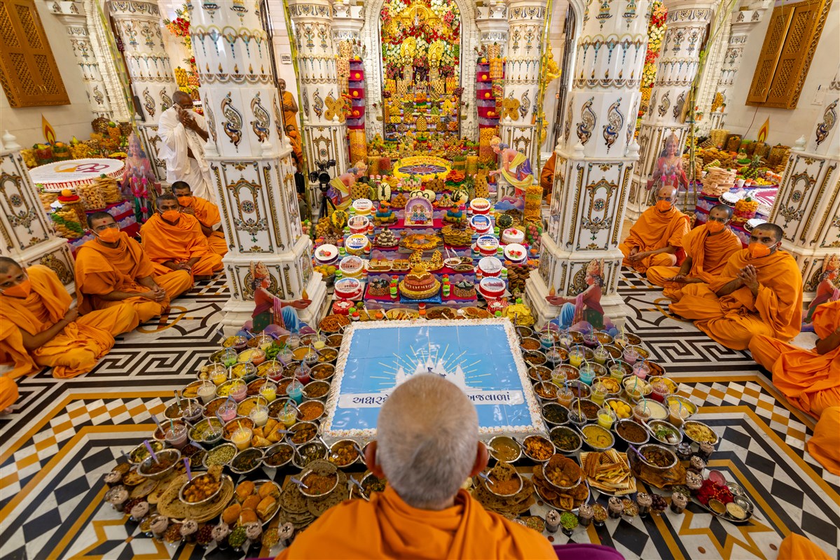 Annakut offered to Shri Akshar-Purushottam Maharaj and Brahmaswarup Yogiji Maharaj in Yogi Smruti Mandir