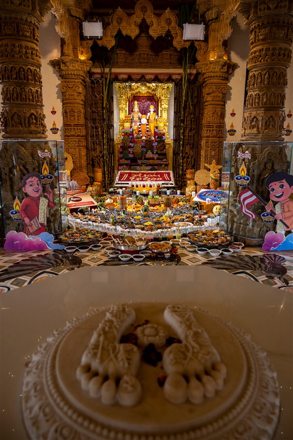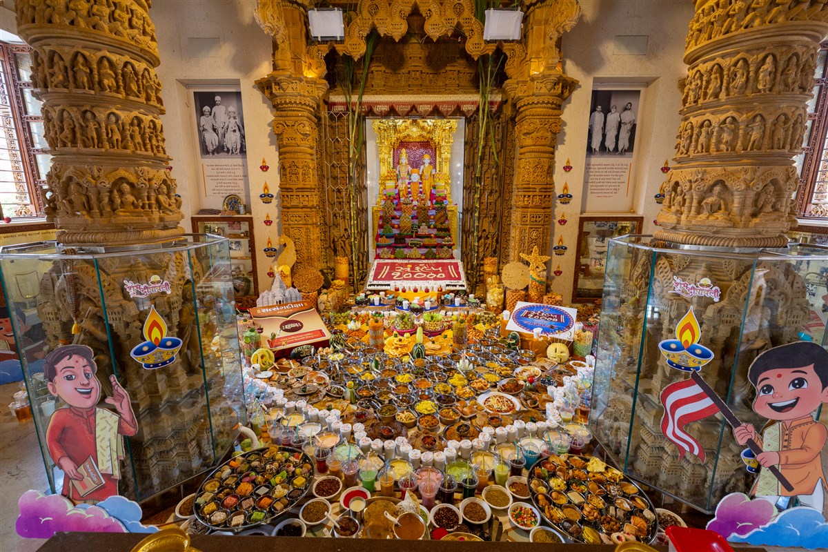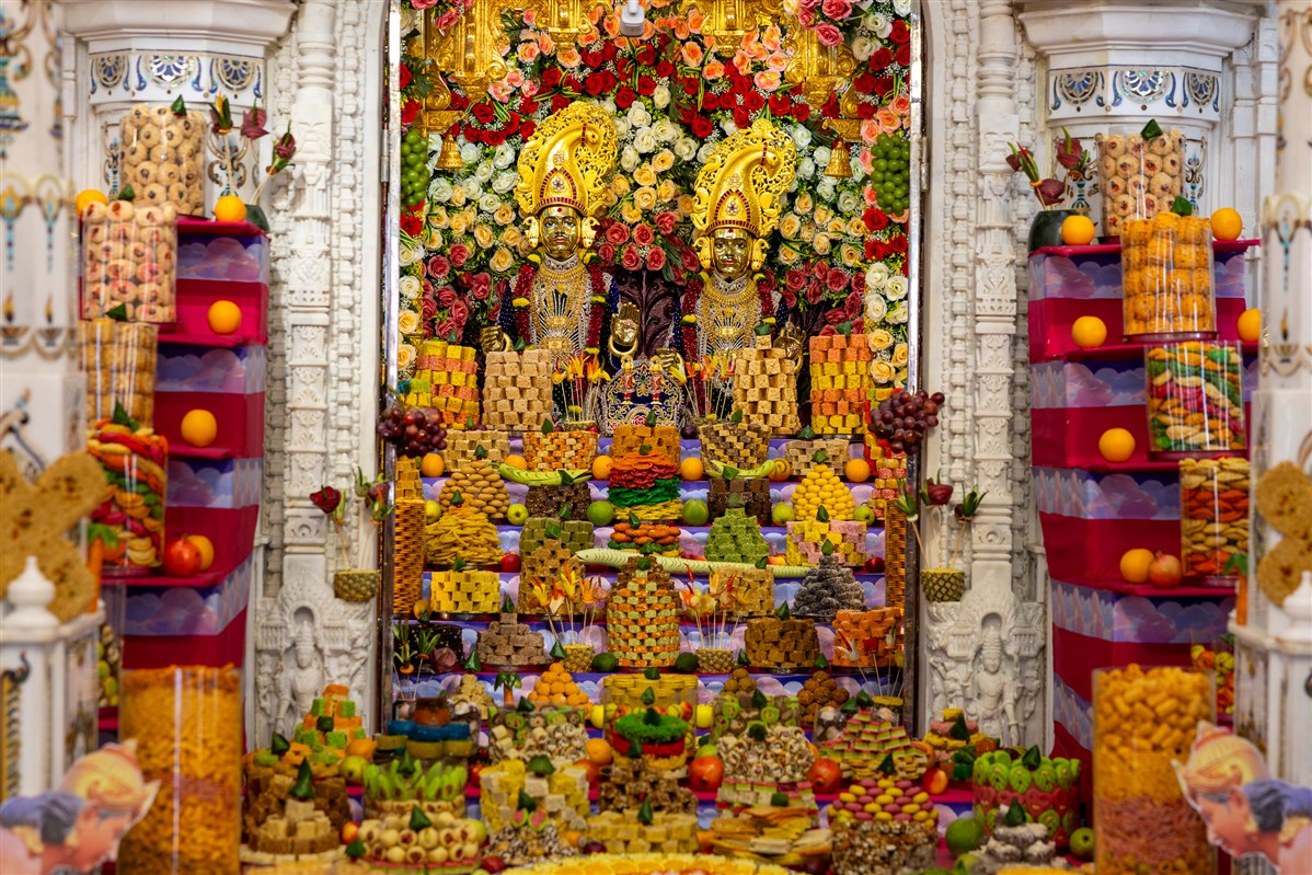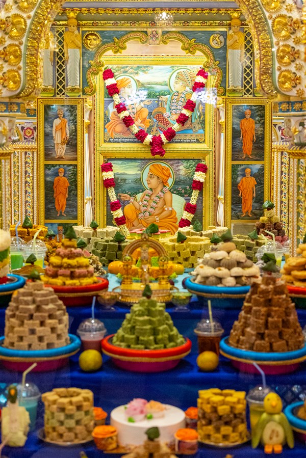 Annakut offered to Shri Akshar-Purushottam Maharaj and Brahmaswarup Yogiji Maharaj