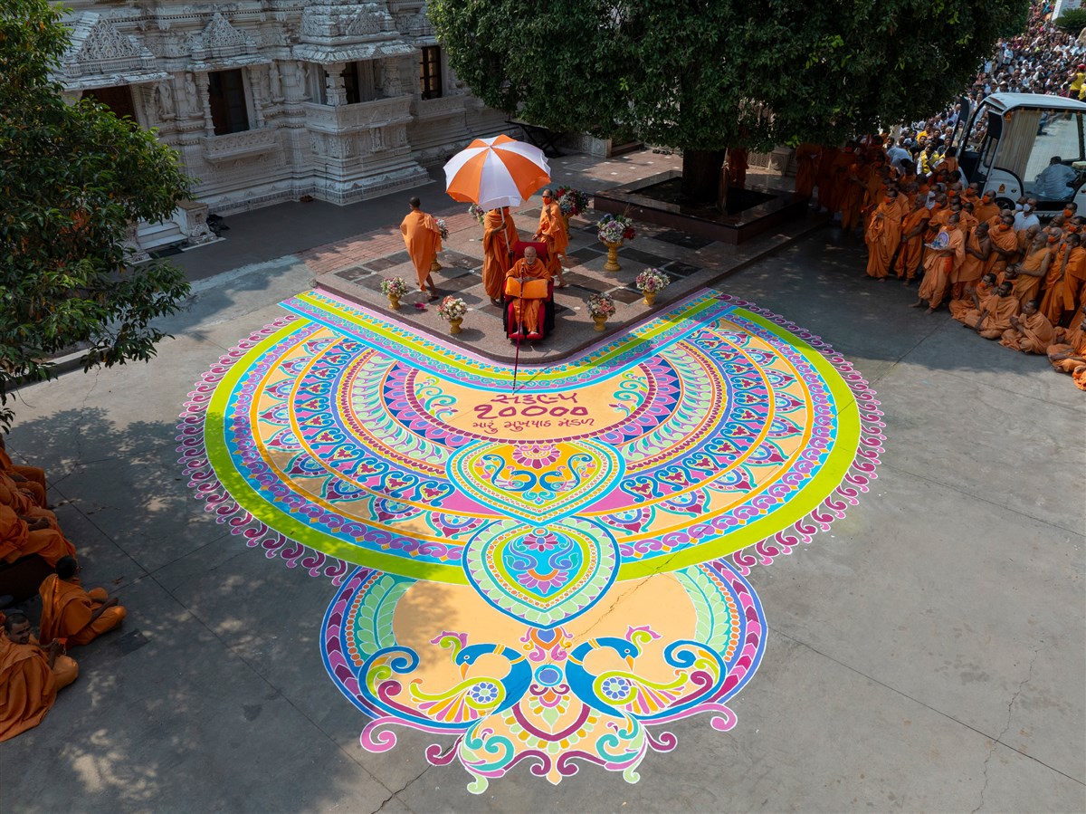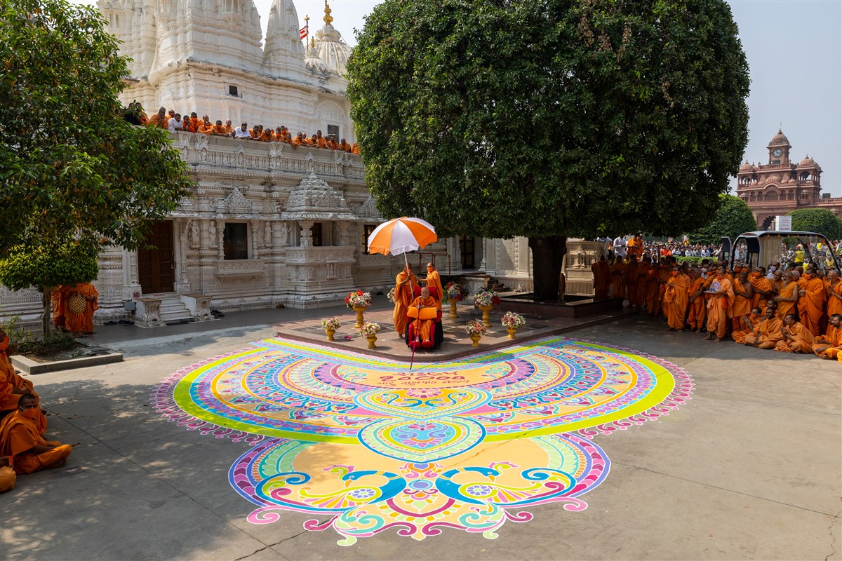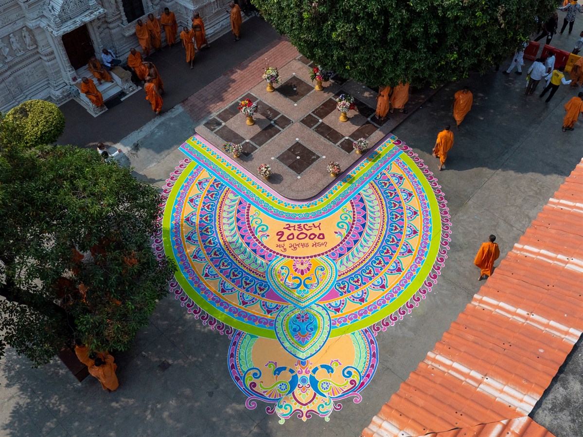 A grand rangoli in the mandir grounds