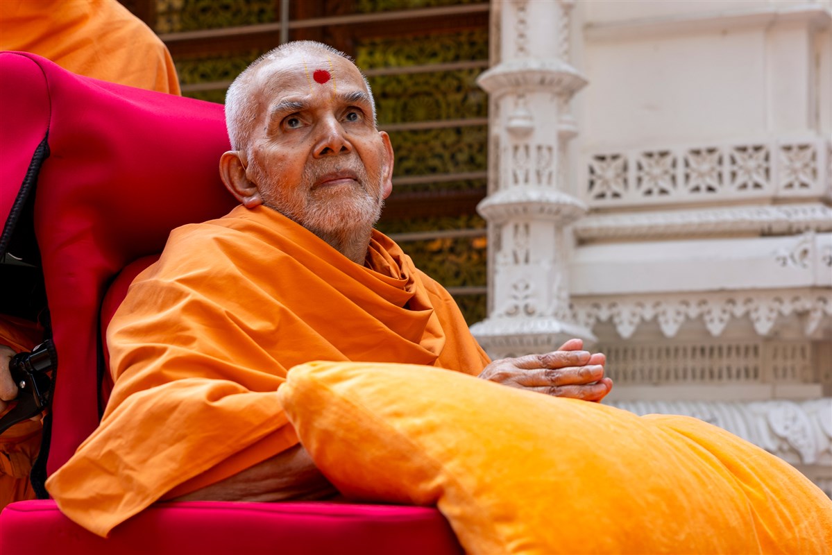 Swamishri after darshan at Yogi Smruti Mandir