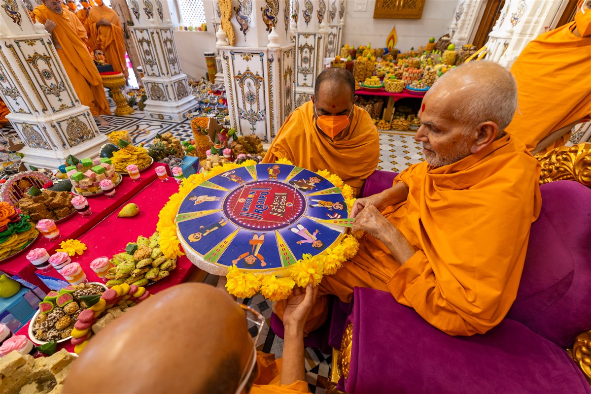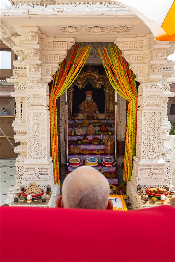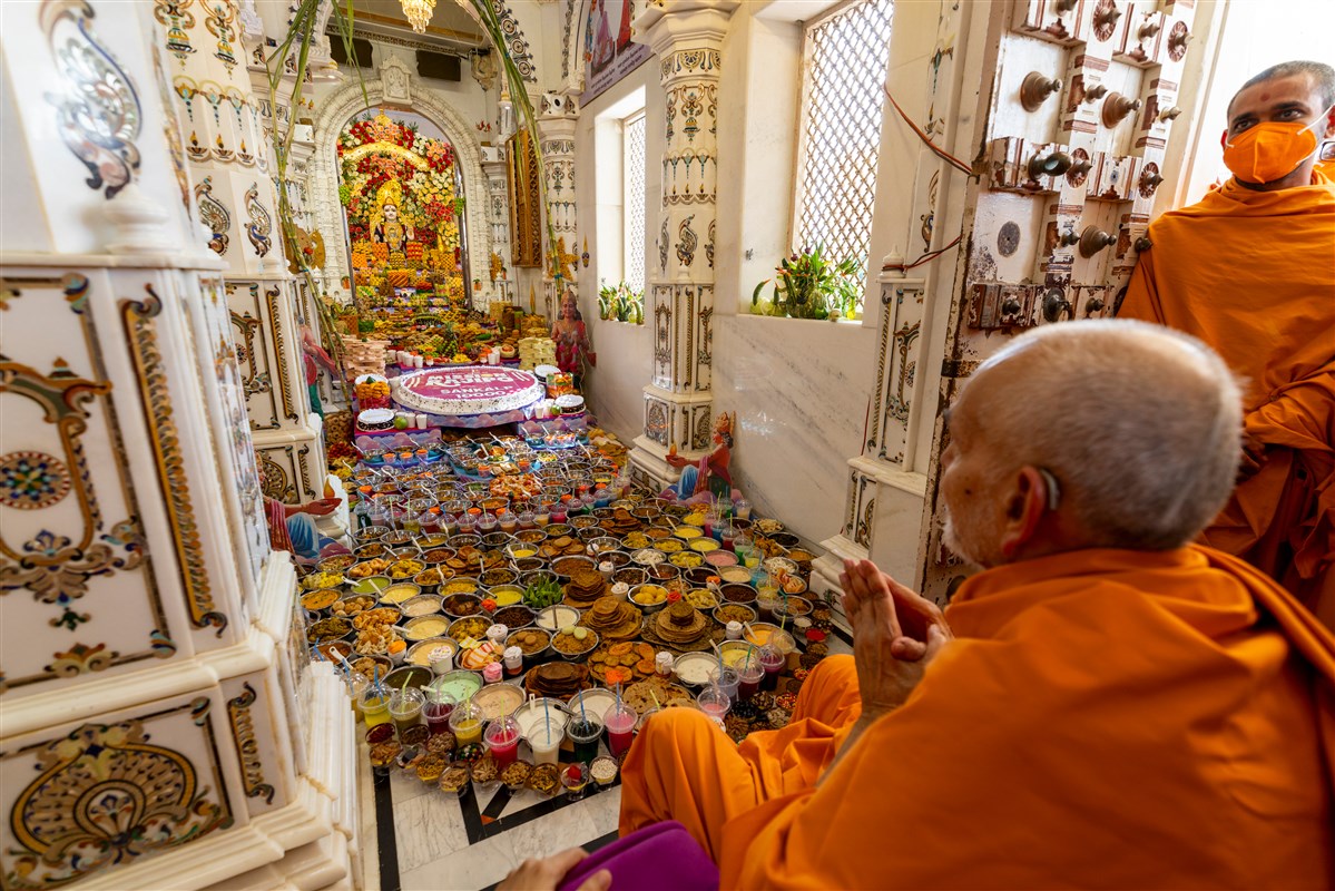 Swamishri doing darshan of the annakut offered to Bhagwan Swaminarayan, Aksharbrahma Gunatitanand Swami and Shri Gopalanand Swami