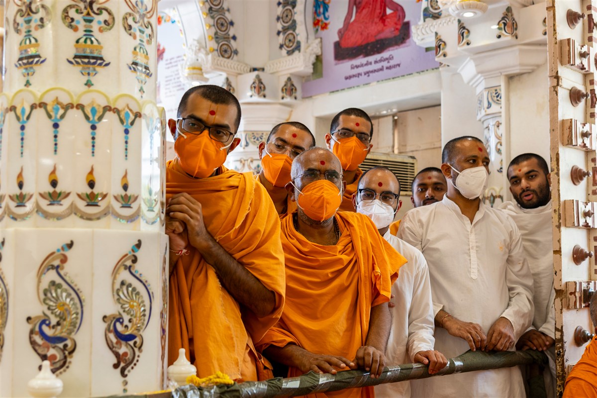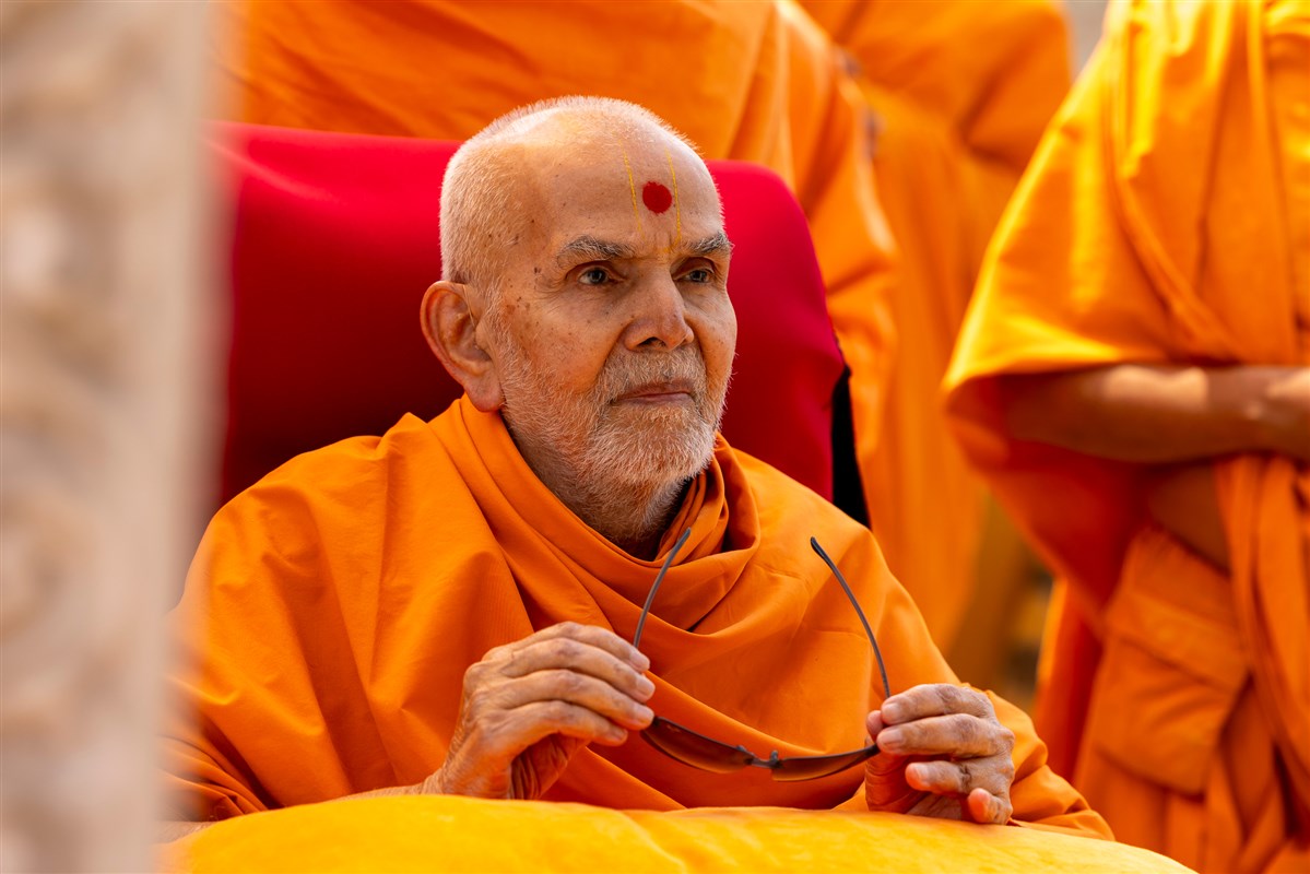 Swamishri observes sabha mandap decorations