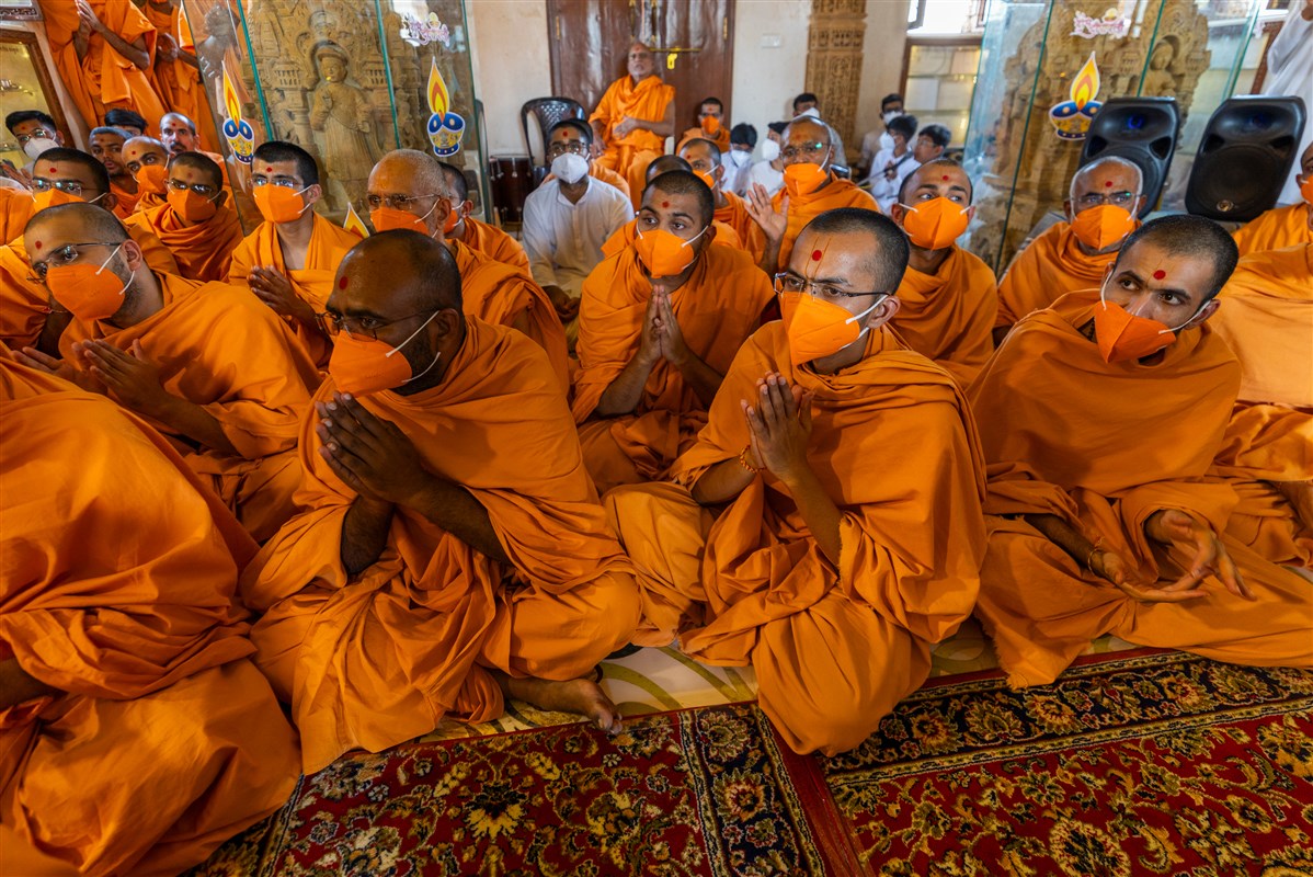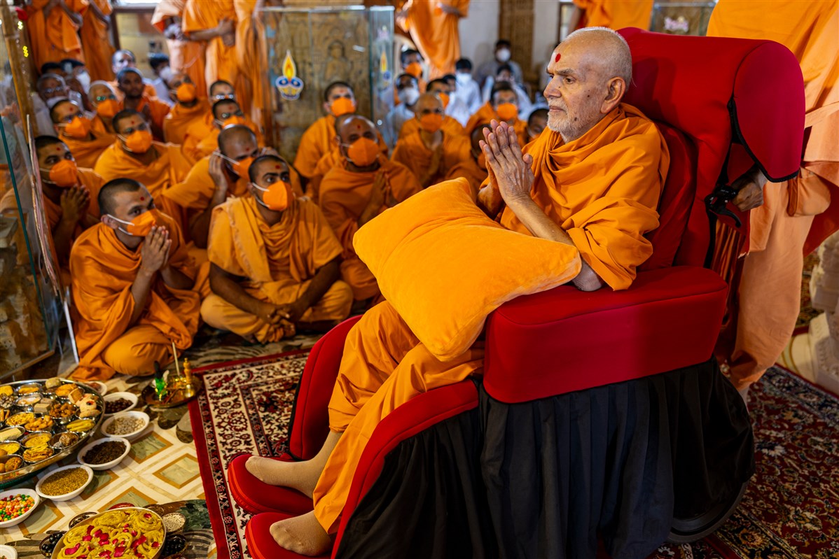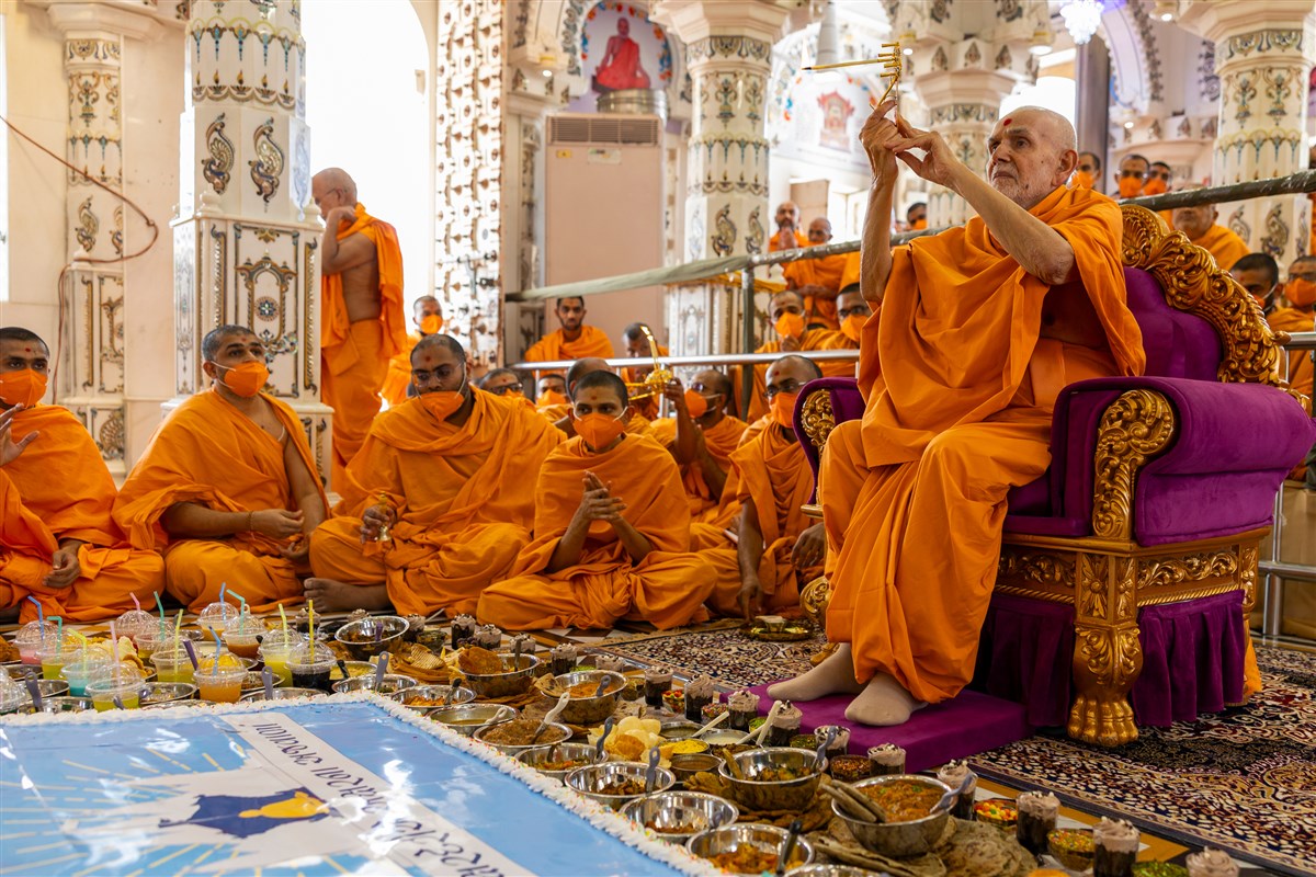 Swamishri sings thals to offer the annakut to Thakorji in the Akshar Deri