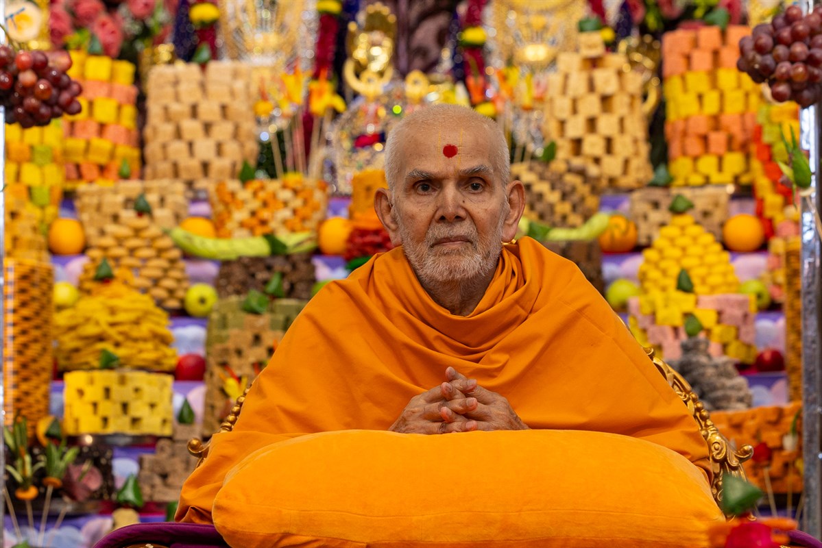 Swamishri amid the annakut in the main mandir