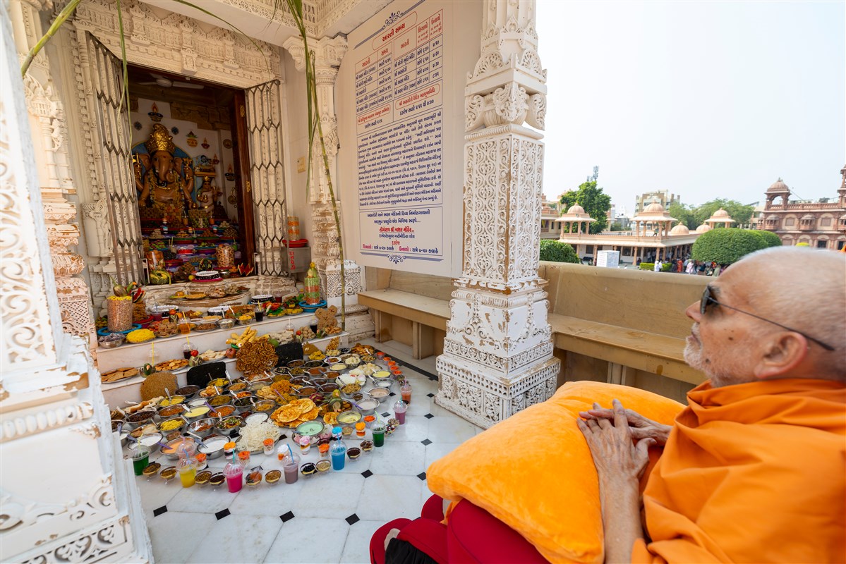 Swamishri doing darshan of the annakut offered to Shri Ganeshji