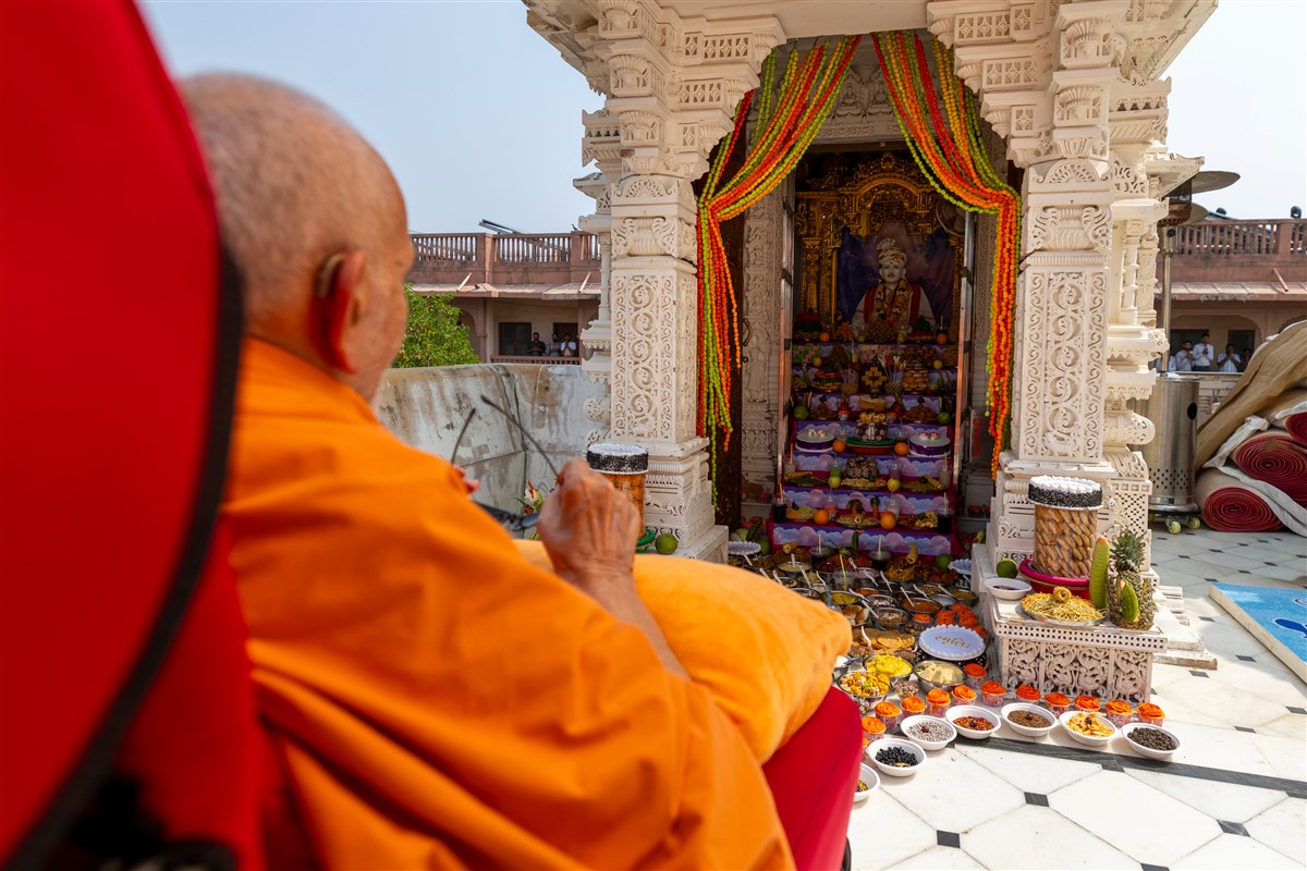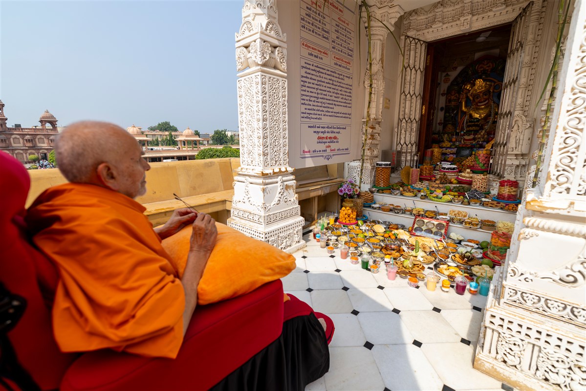 Swamishri doing darshan of annakut offered to Thakorji in the Akshar Deri