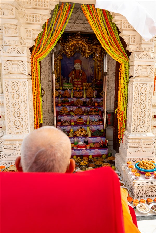 Swamishri doing darshan of the annakut offered to Shri Ghanshyam Maharaj