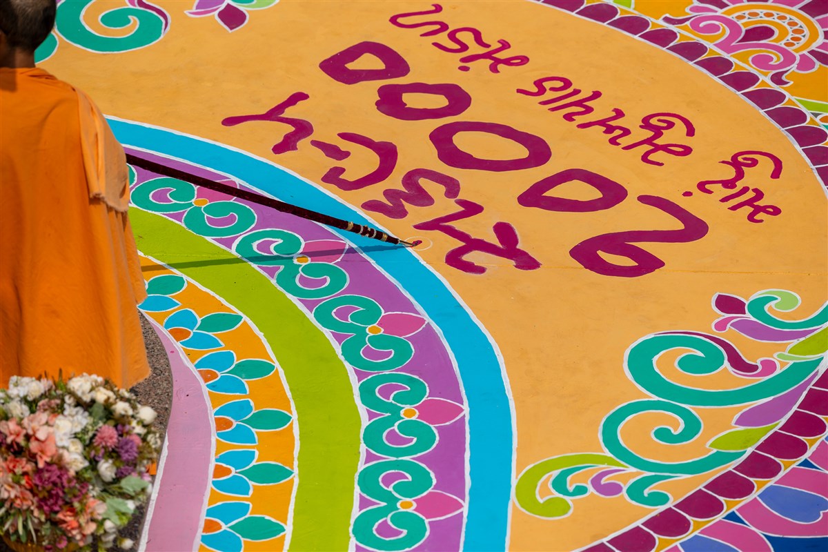 Swamishri adds a color to the rangoli